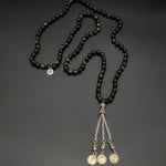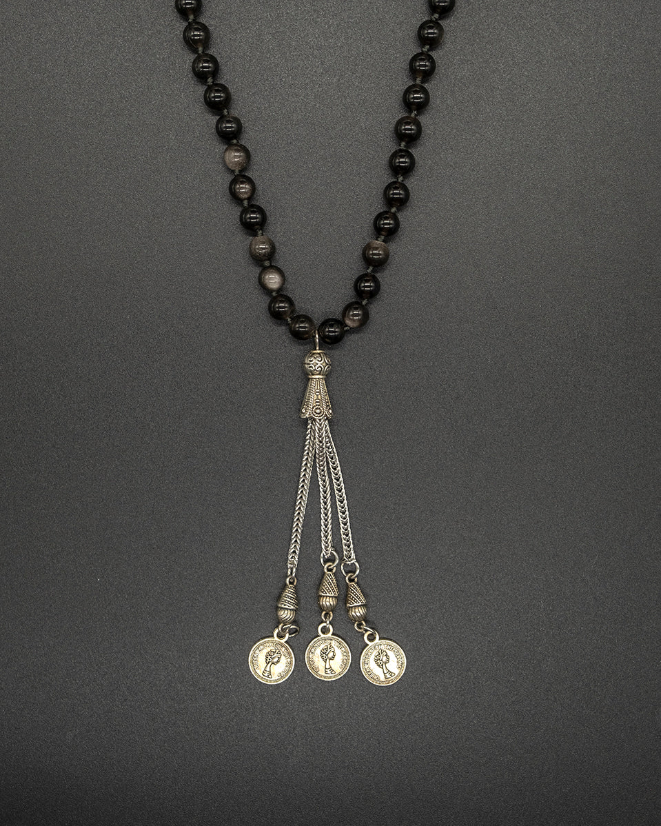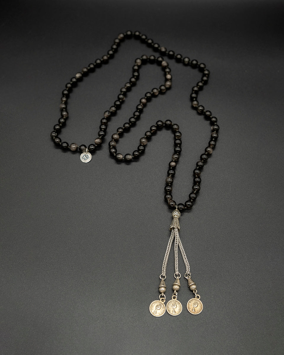 Obsidian 108 Mala with Coin Tassel and Non-Silver Guru Bead — a grounding and protective piece that channels strength and clarity. The deep black obsidian absorbs negative energy, while the coin tassel adds a touch of balance, symbolizing abundance and steady flow in life’s journey.