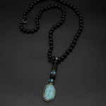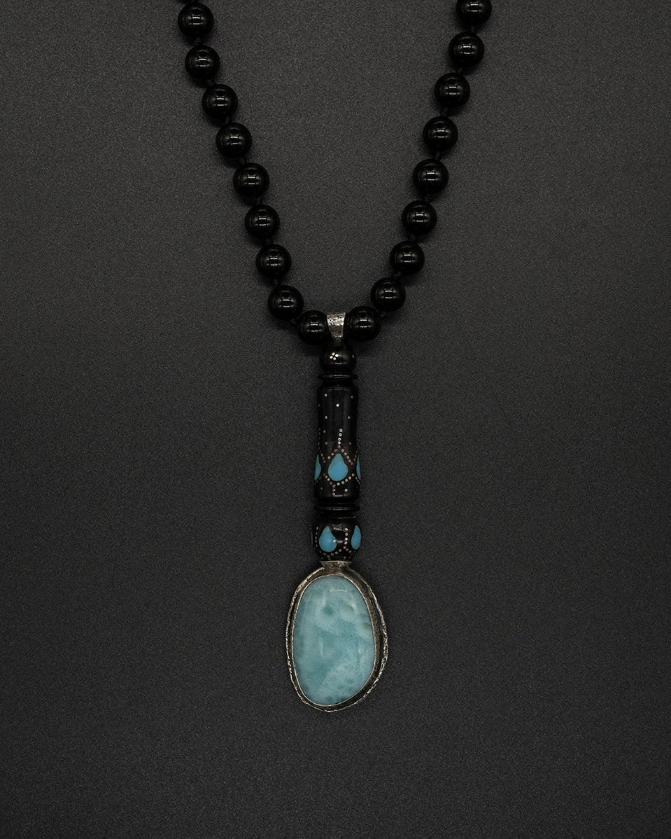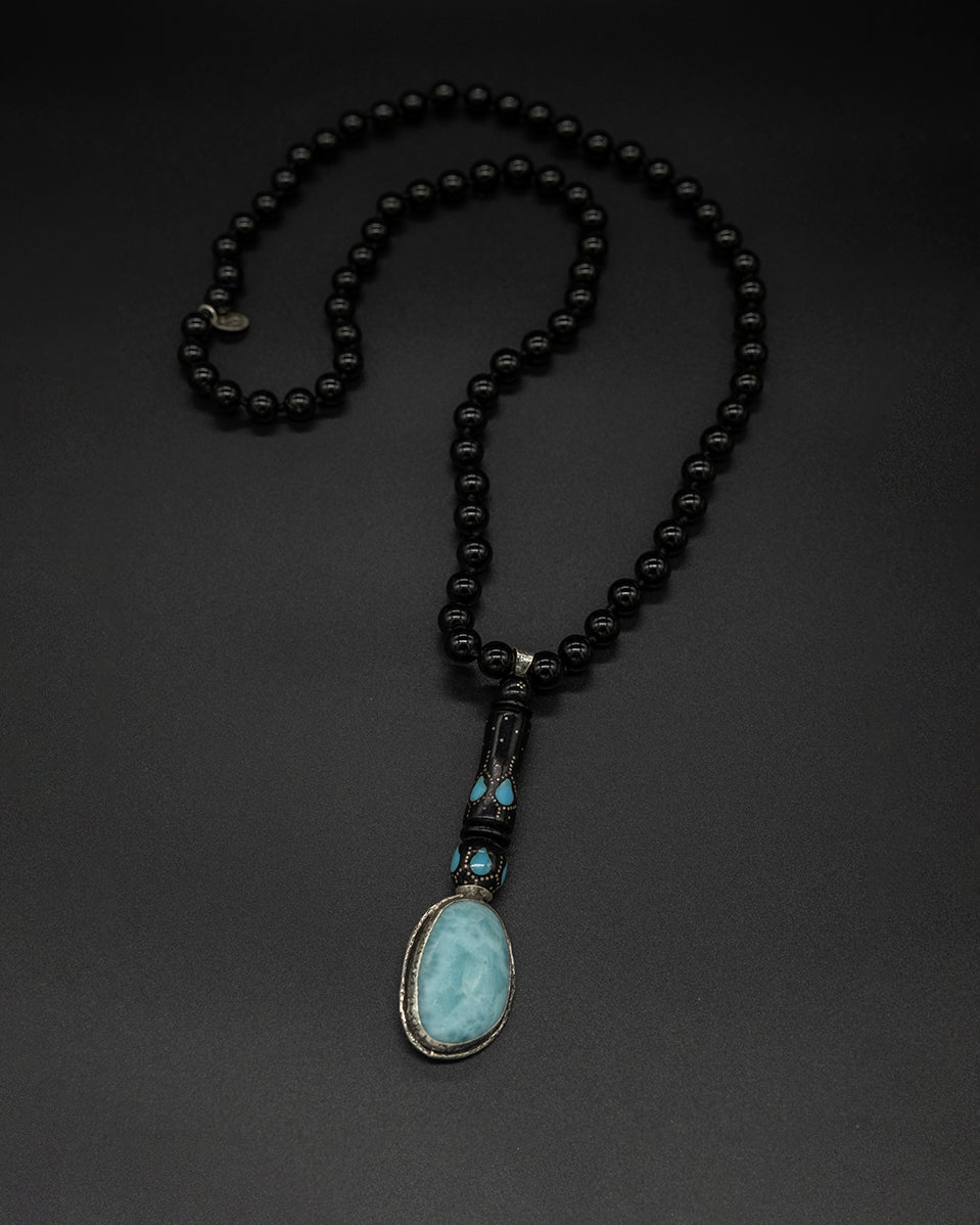 This necklace features a stunning larimar stone pendant elegantly framed in silver and capped with a vintage blue bead. The striking contrast of the black tourmaline chain adds a touch of sophistication, while the larimar is believed to enhance communication with all living things, connecting you deeply to the essence of Mother Nature and the serene beauty of the sea.