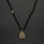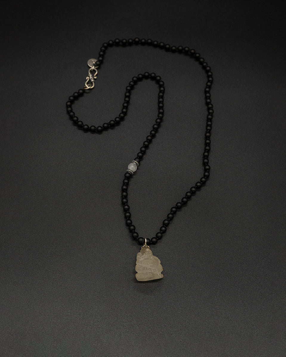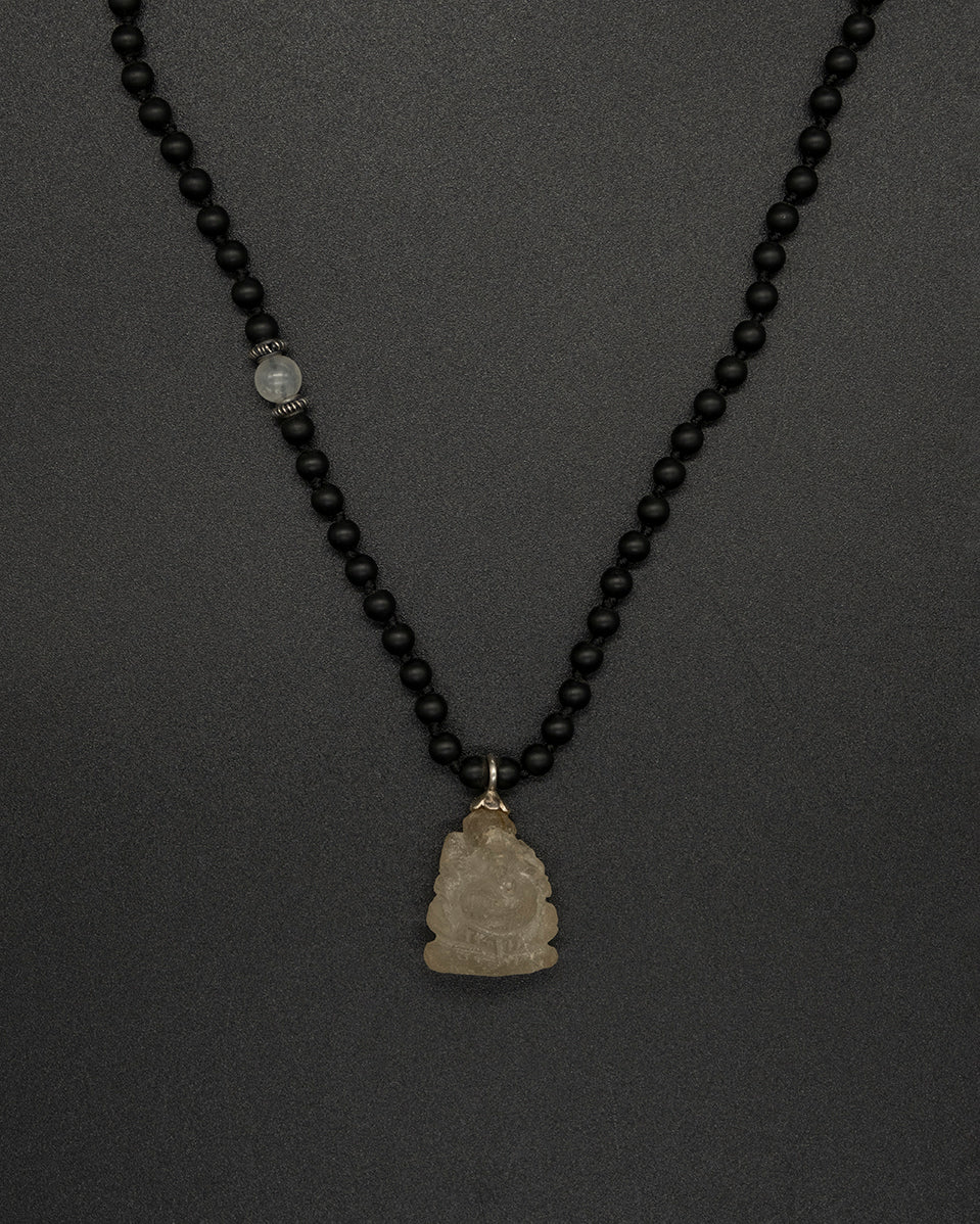 This divine Hindu God, Ganesha, is known to be the remover of obstacles, in our minds. The Ganesha pendant details are carved out of Crystal and come with onyx chain for a glowing finish.