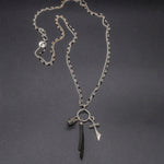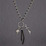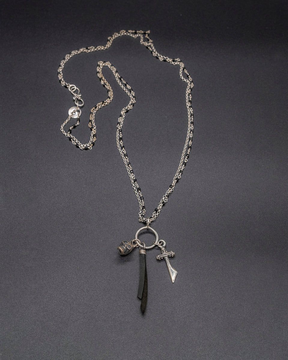 A bold multi-charm pendant combining skull, sword, and leather elements, symbolizing strength and resilience. Hanging from a double chain of silver and onyx, this piece balances raw power with refined elegance—perfect for those who embrace fearless individuality.