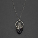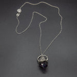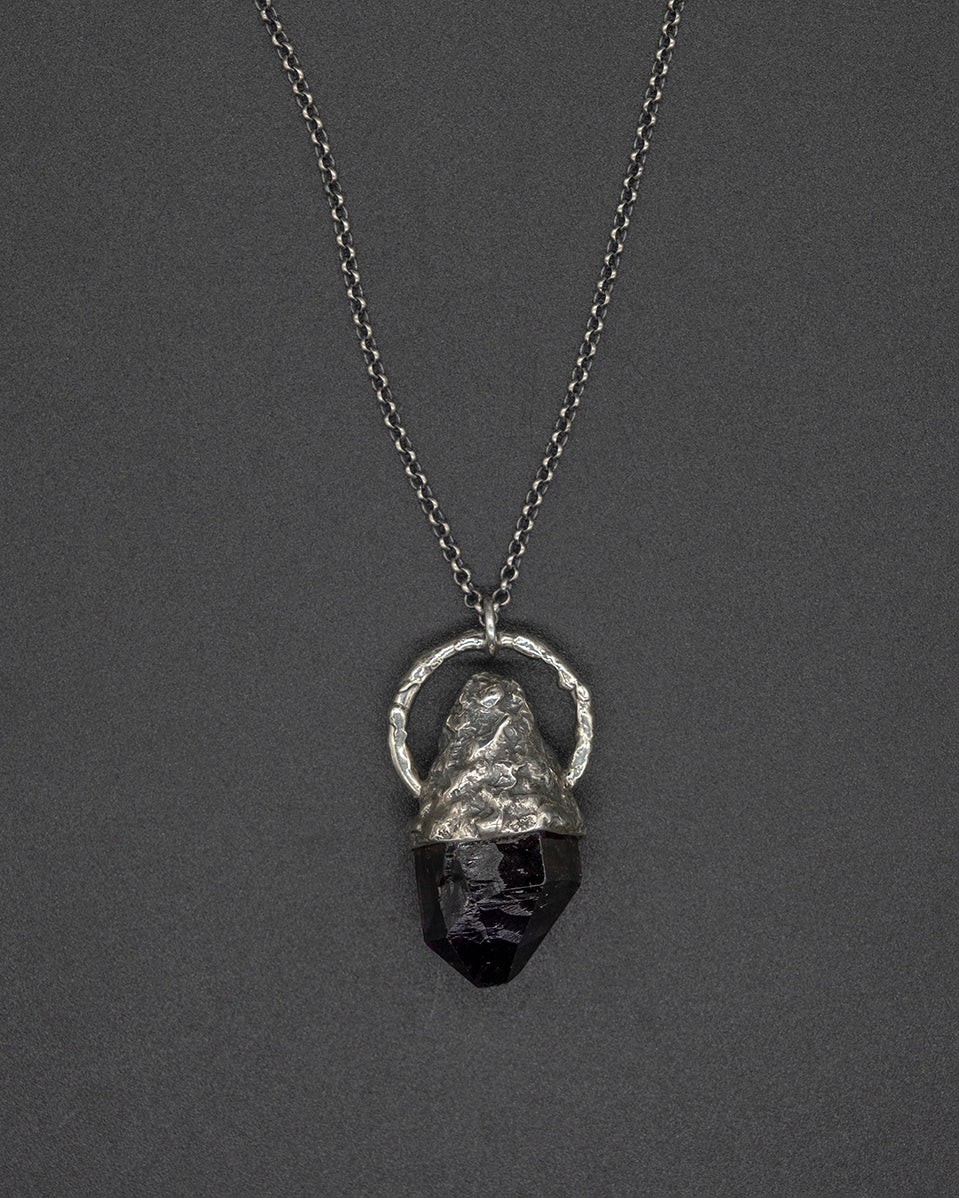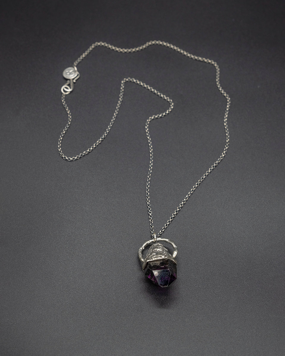 This necklace is carefully crafted, featuring a raw cut, Super 7 crystal brought from Brazil. The play of purple hues that shimmer, when the light hits it, is guaranteed to make a statement. The Super 7 Crystal is renowned for its powerful healing properties. It promotes inner well-being, balances energy, and encourages intuition and spiritual growth. To complement its raw charm, the crystal is hugged by a hand-textured silver belt and paired with a matching silver link chain.