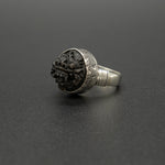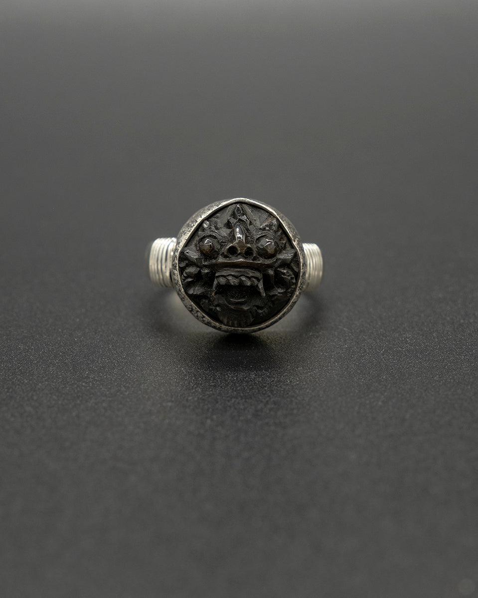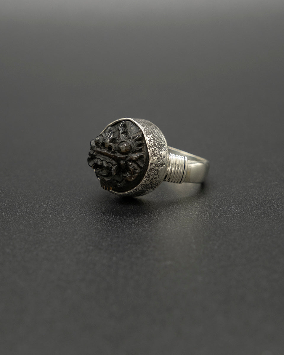 This ring combines a smaller version of our hand-carved buffalo horn Barong set in a sterling silver setting that is fully crafted in Bali. With its interesting and intricate design, this ring symbolizes the power of the king of spirits.