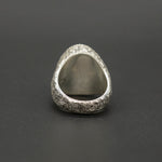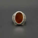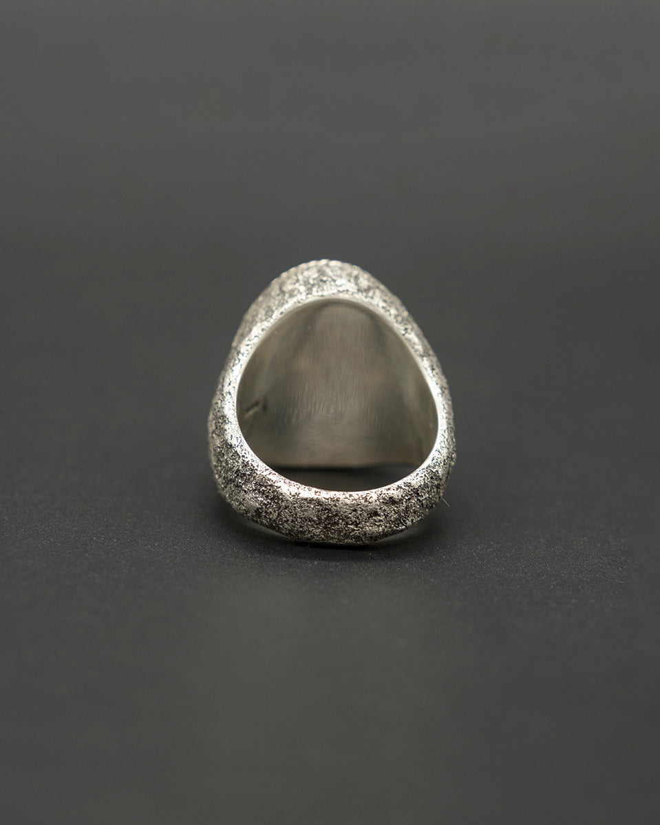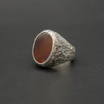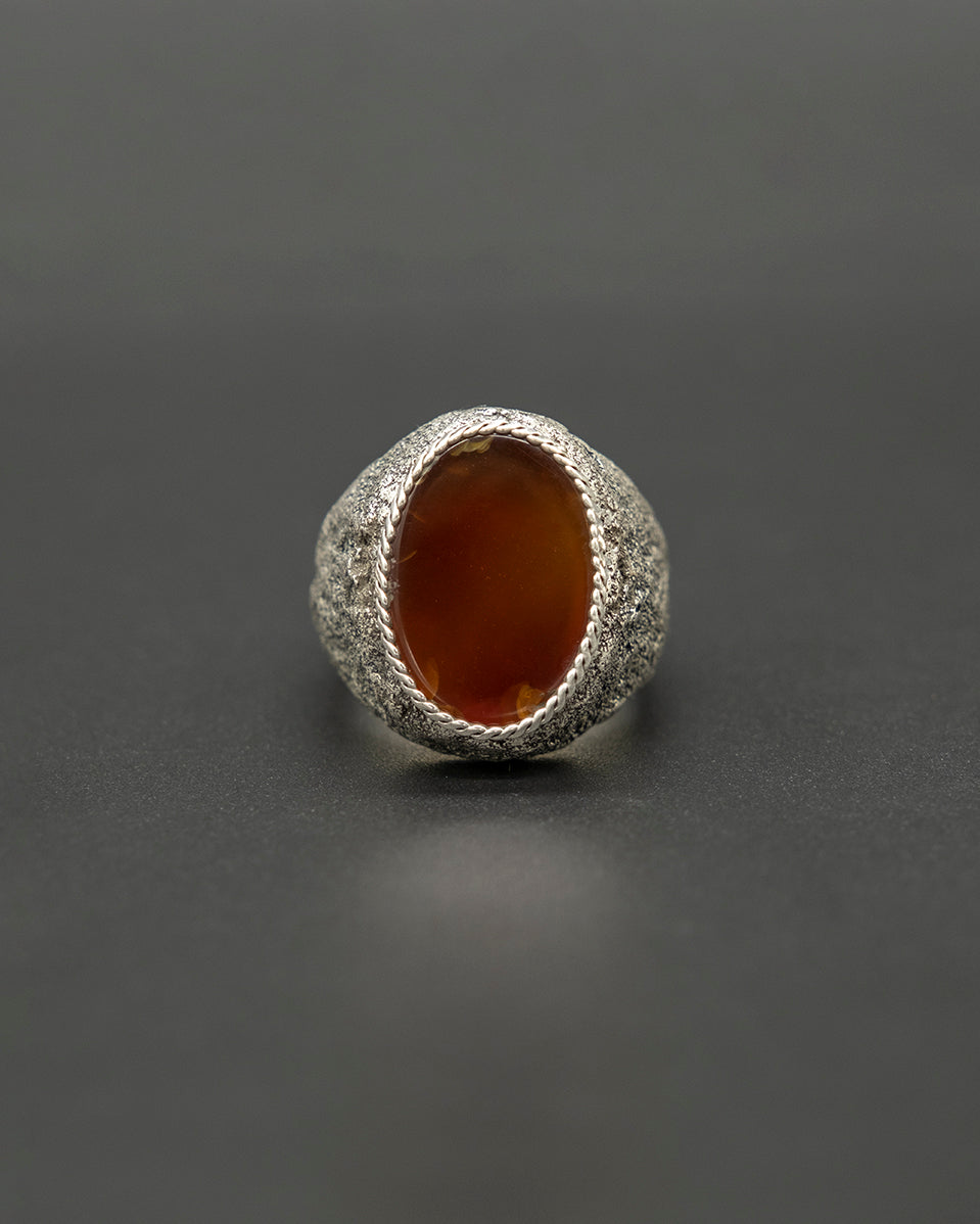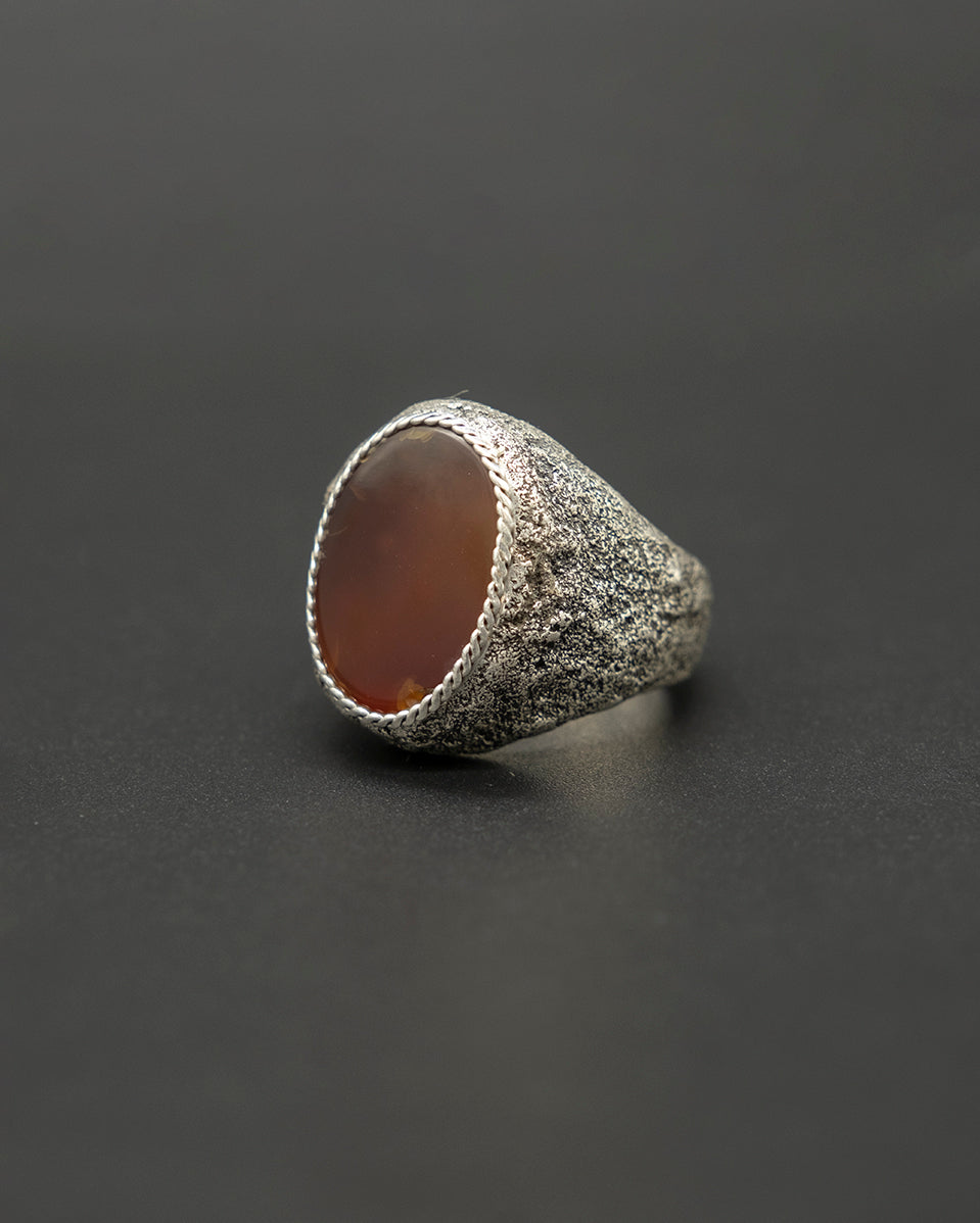 A silver-dusted signet ring set with a natural agate stone, blending raw elegance with quiet strength. The textured silver gives it an ancient, lived-in character, while the agate center adds grounding energy. A timeless piece with subtle tribal soul.