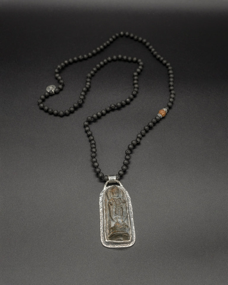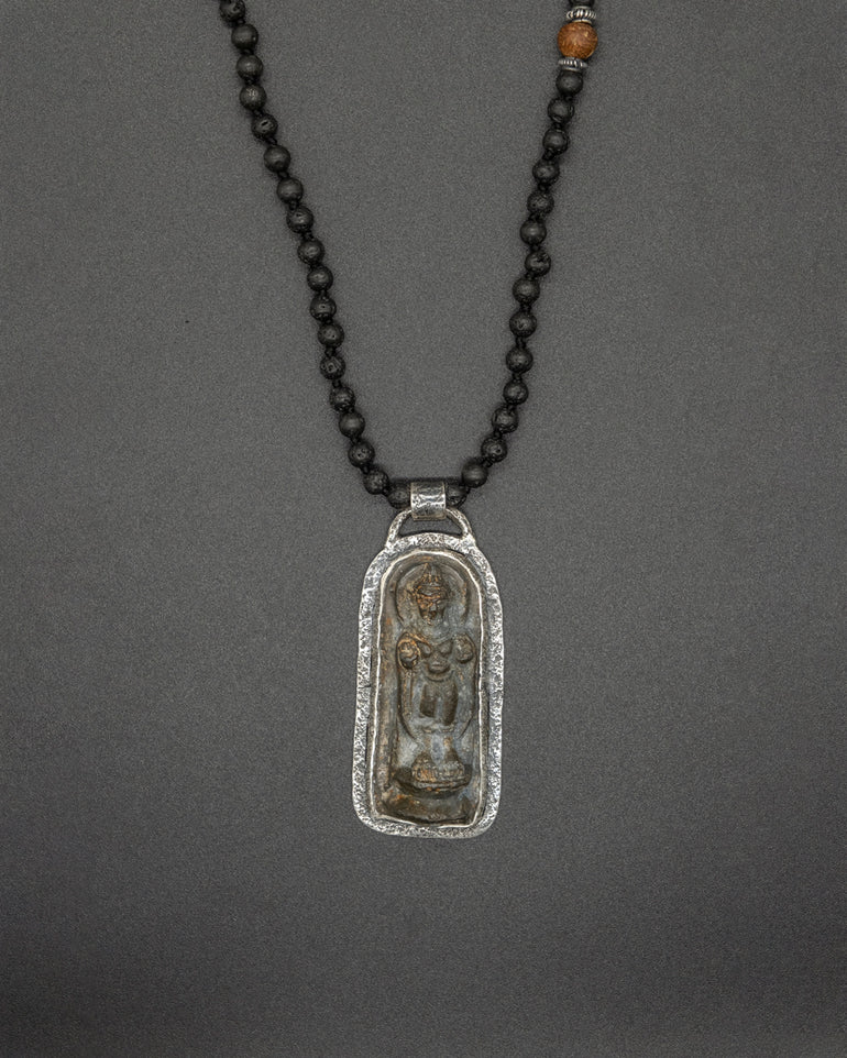 Embrace spiritual depth and earthy strength with this Vintage Metal Carved Buddha Pendant, set in a textured silver frame. The pendant is beautifully paired with a hand-knotted chain of lava stone and moringa wood beads, symbolizing grounding and natural vitality. A harmonious fusion of vintage artistry and raw elements, this piece carries a serene, protective energy — a perfect balance of spirituality and style.