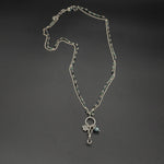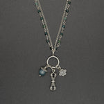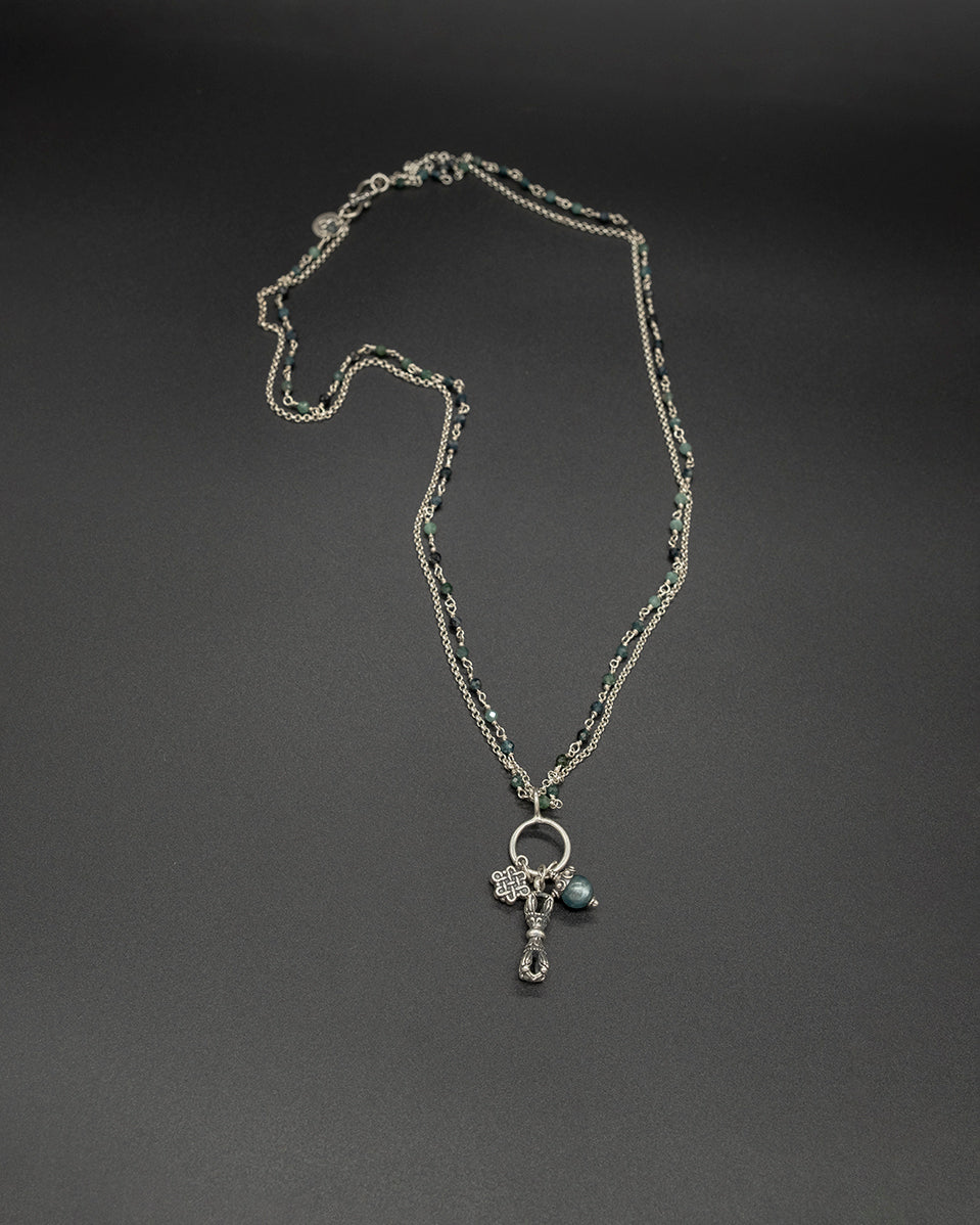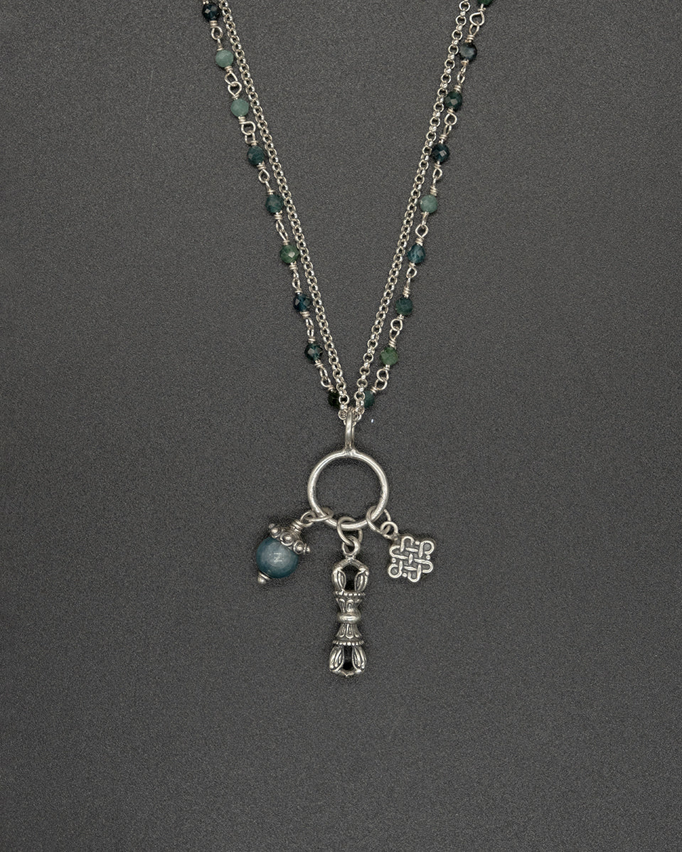 This necklace showcases a collection of enchanting charms. Adorned with a vajra bell that signifies wisdom, an endless knot for energy, and a gorgeous green kyanite orb radiating tranquility, this necklace is captivating. The charms dangle gracefully from a silver and tourmaline double chain.