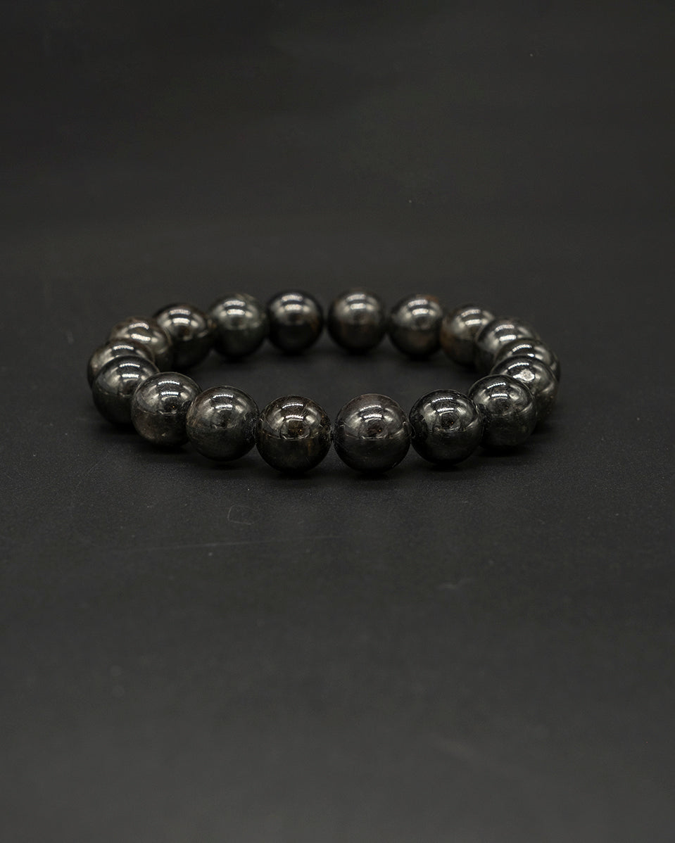 Deep black sapphire beads, 12 mm, strung on strong elastic. Polished natural stones for a sleek, elegant, and versatile everyday look.