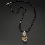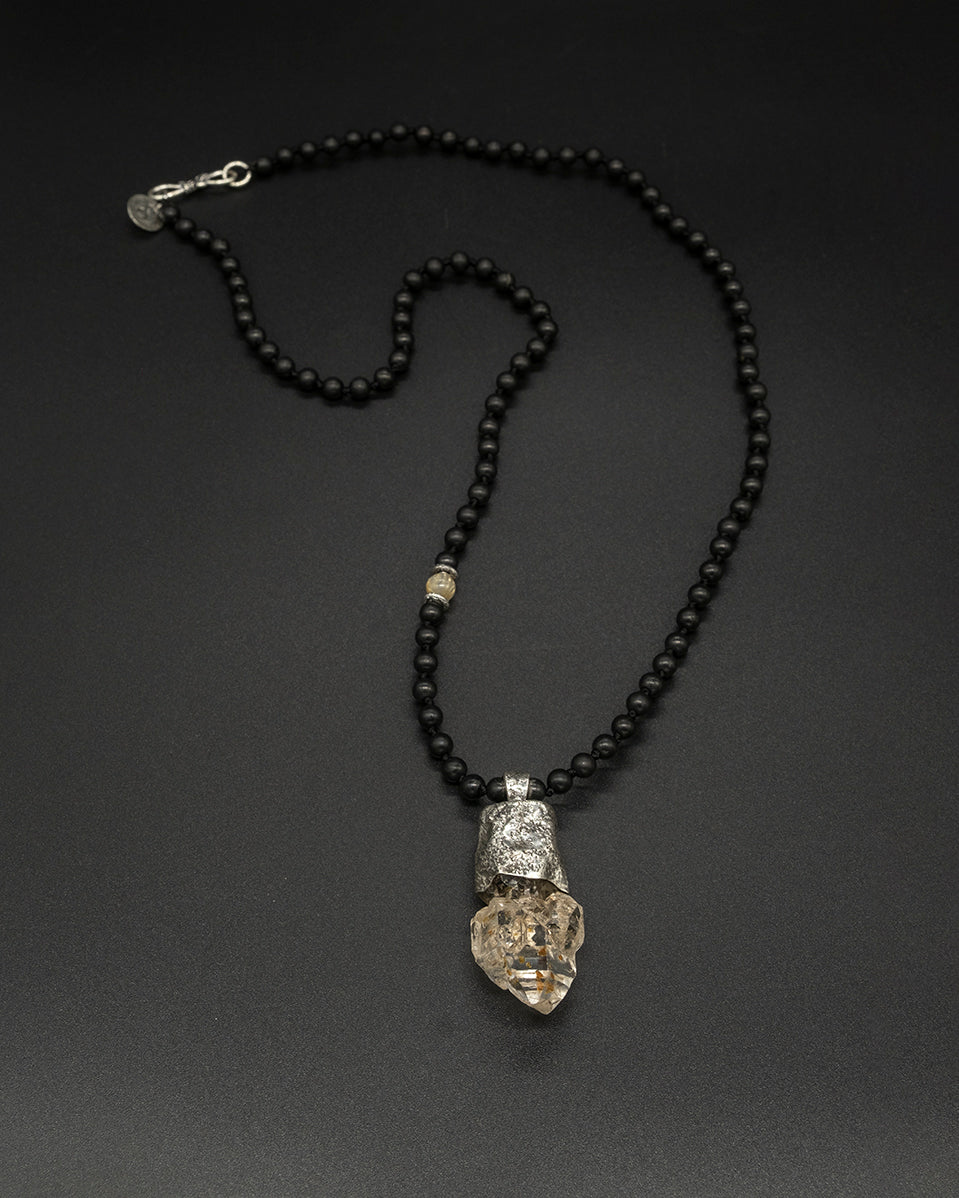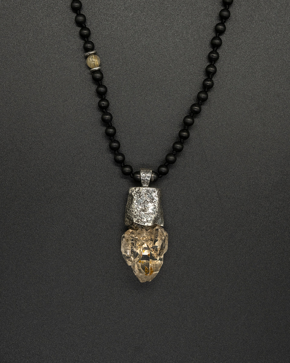 A striking combination of rare diamond quartz and golden enhydro quartz, paired with silver shungite and silver rutilated quartz along the chain. A powerful blend of natural rarity, sparkling texture, and grounding energy—bold, elegant, and uniquely captivating.