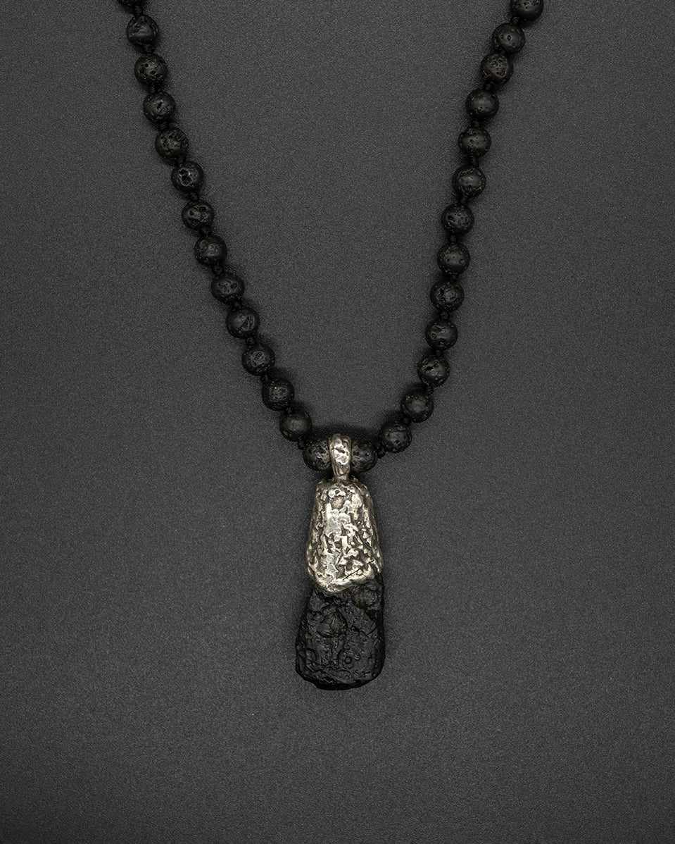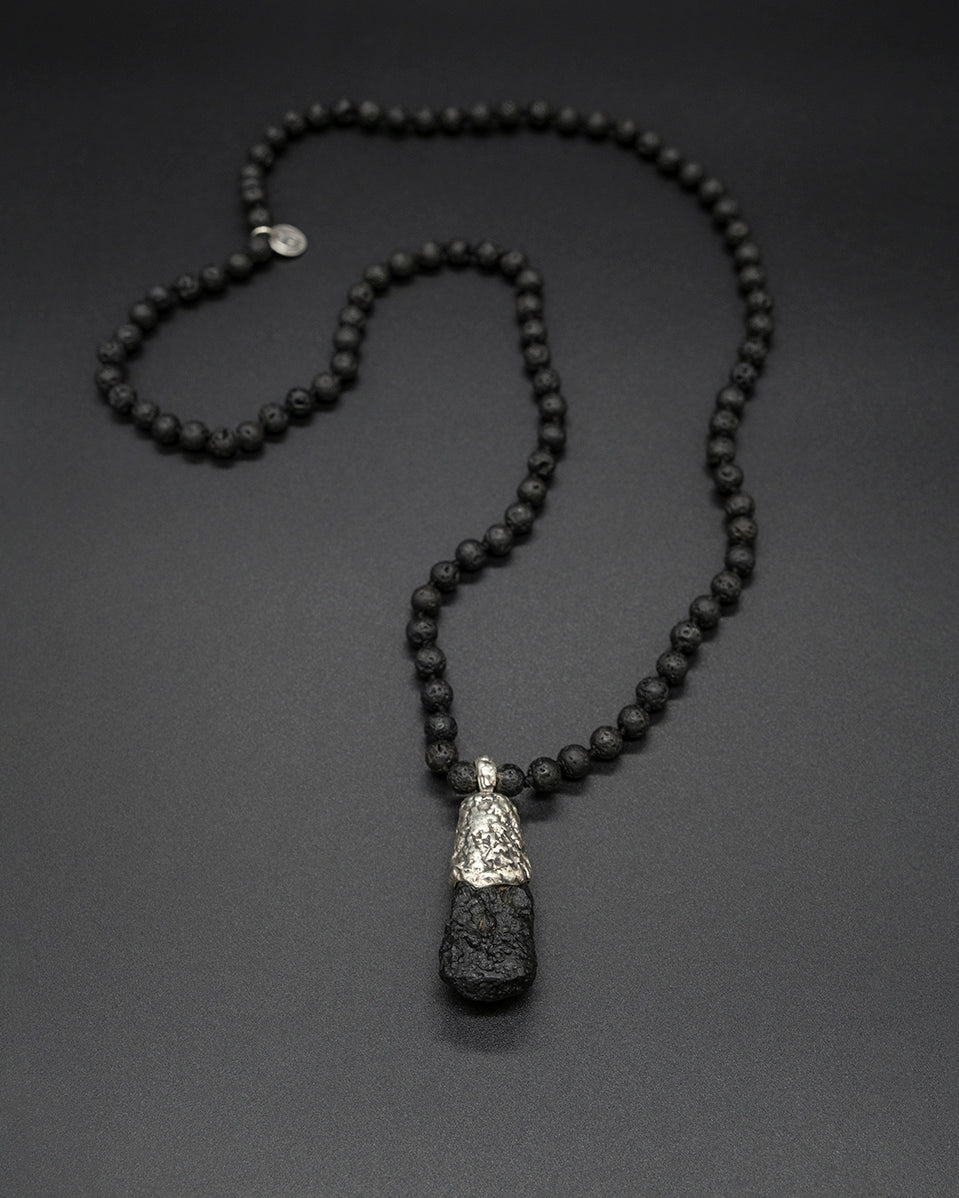 Unleash your inner strength with this Tektite drop pendant, paired with a black lava stone chain. The tektite and lava stones enhance grounding and spiritual growth. A striking piece that embodies powerful energy and transformation.