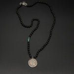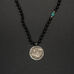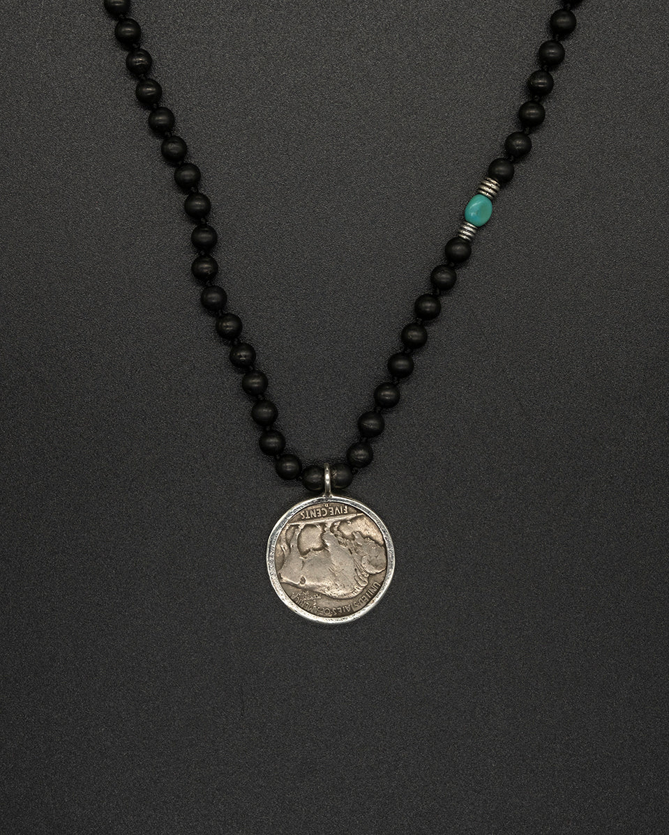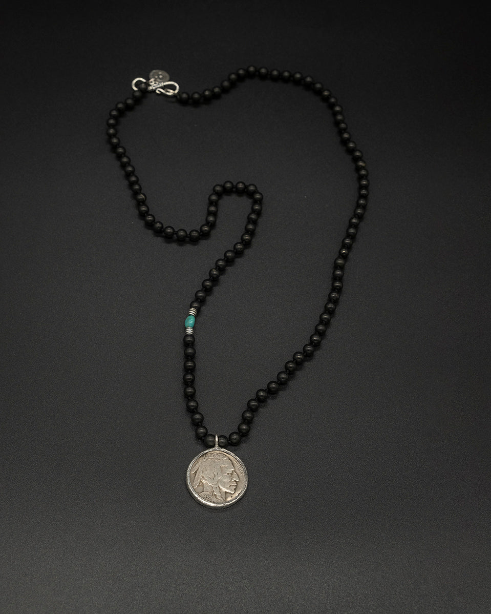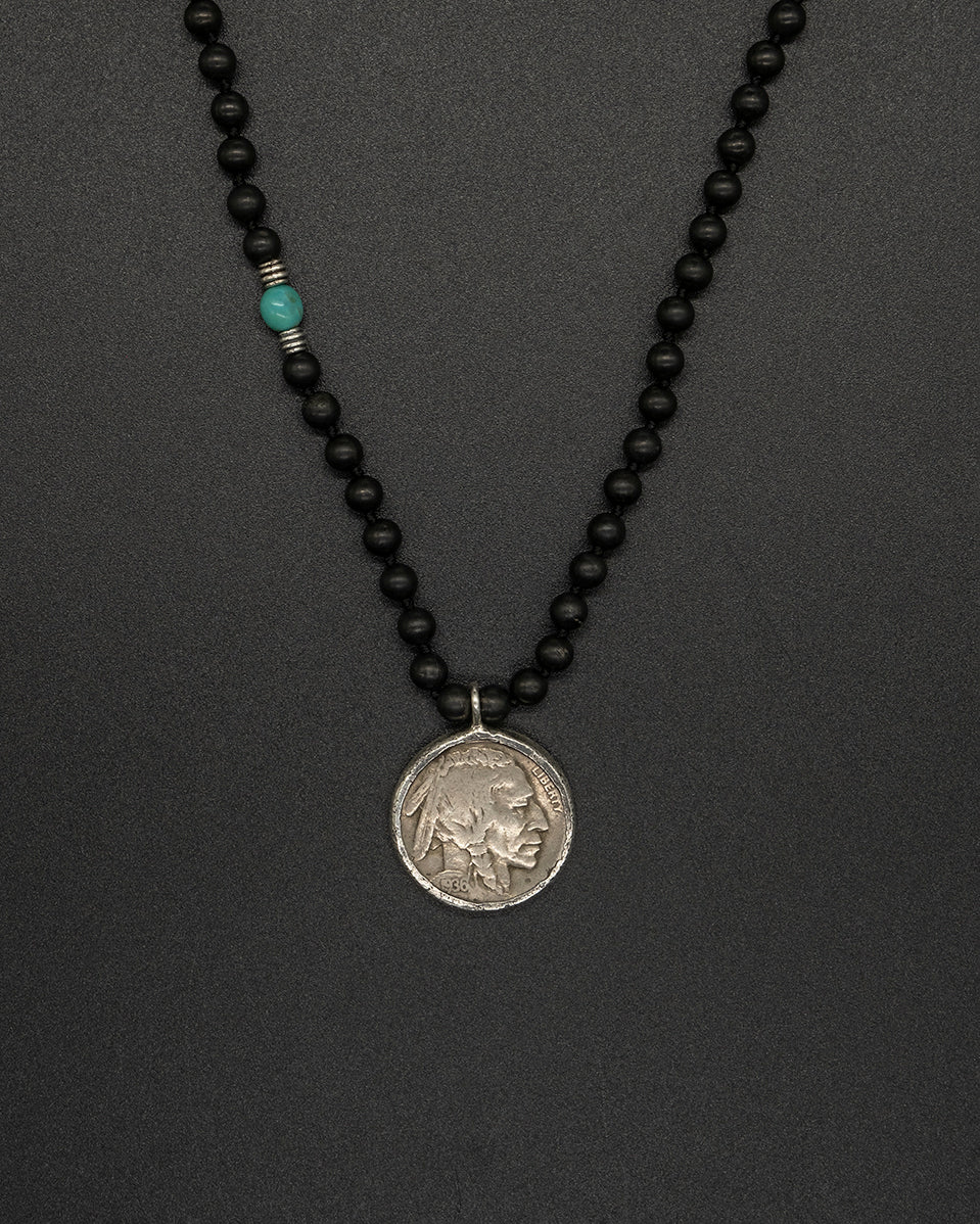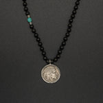 A meaningful heritage piece featuring an authentic- Buffalo nickel coin — a symbol of prosperity, protection, and ancestral wisdom. Paired with a handcrafted onyx and turquoise bead chain, the grounding strength of onyx balances the guiding clarity of turquoise. Each element is intentionally chosen, creating a timeless talisman that carries cultural spirit, steady energy, and a touch of ancient legacy.