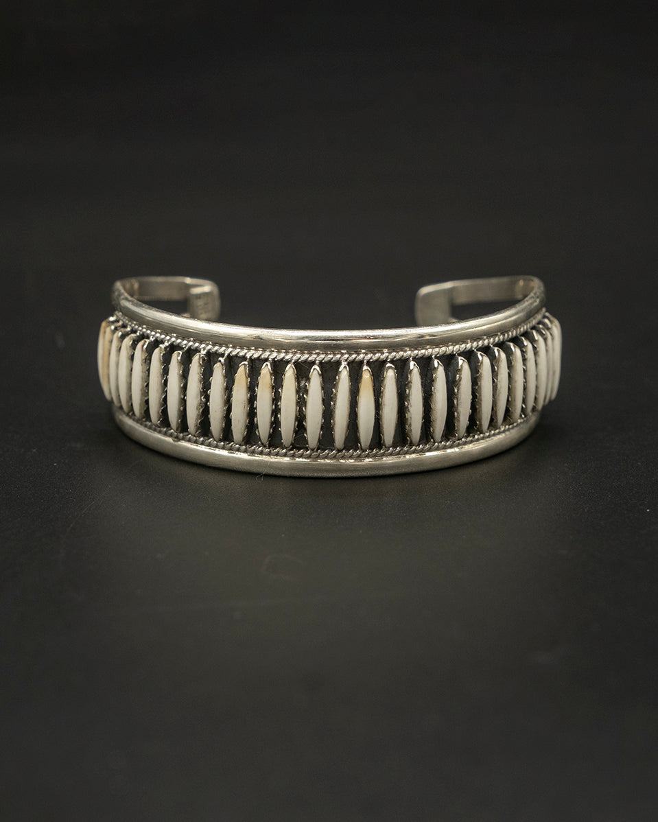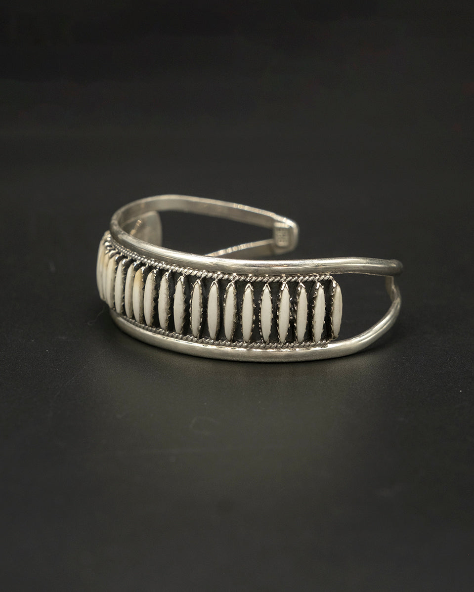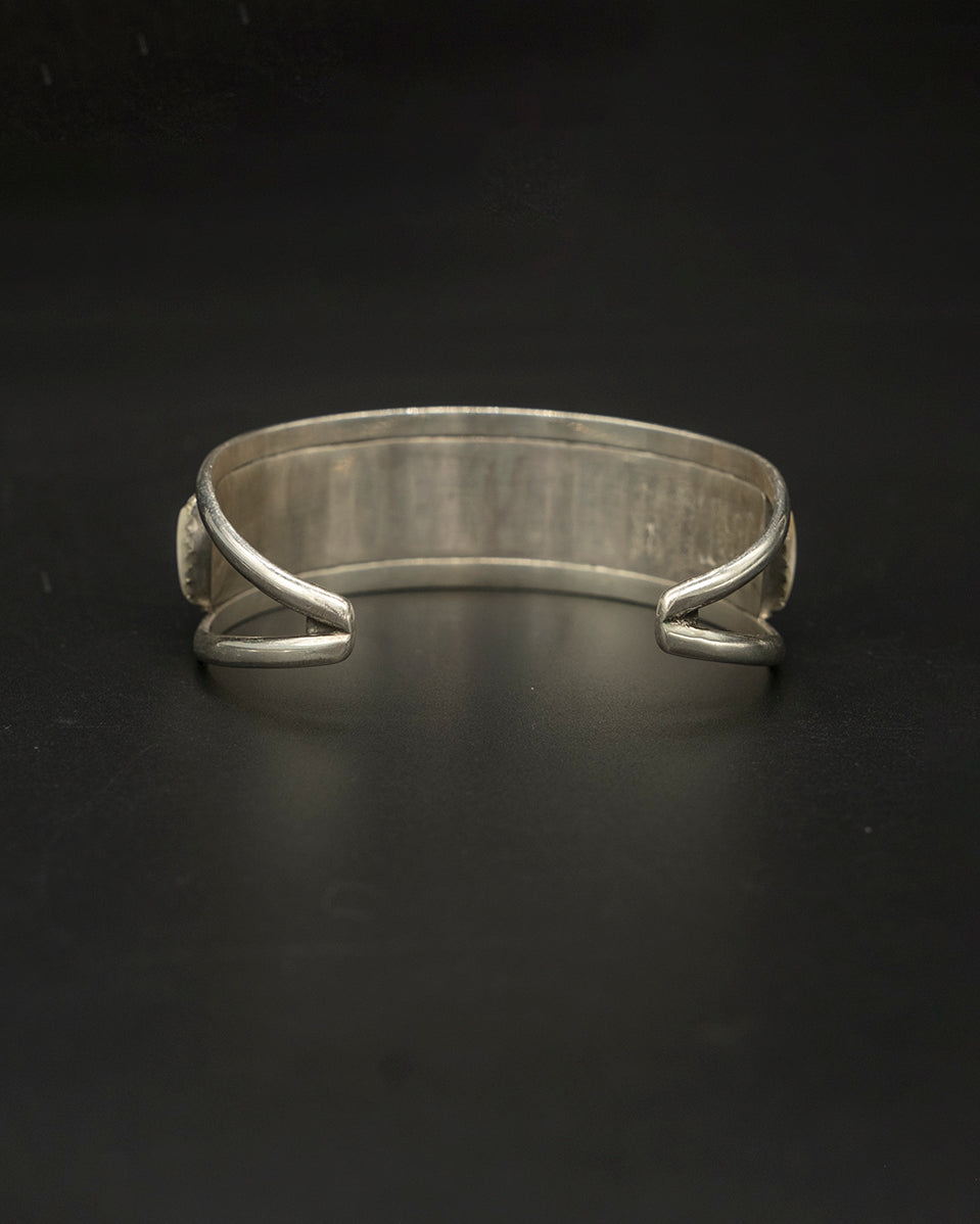 A refined Navajo-inspired piece crafted in sterling silver cuff and with white, turquoise — a stone honored for its calming energy and protective spirit. In Native American tradition, white, turquoise symbolizes purity, wisdom, and sacred guidance. Clean, understated, and full of quiet power, this talisman carries traditional Navajo character and timeless strength.