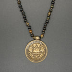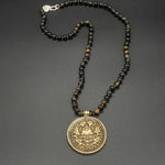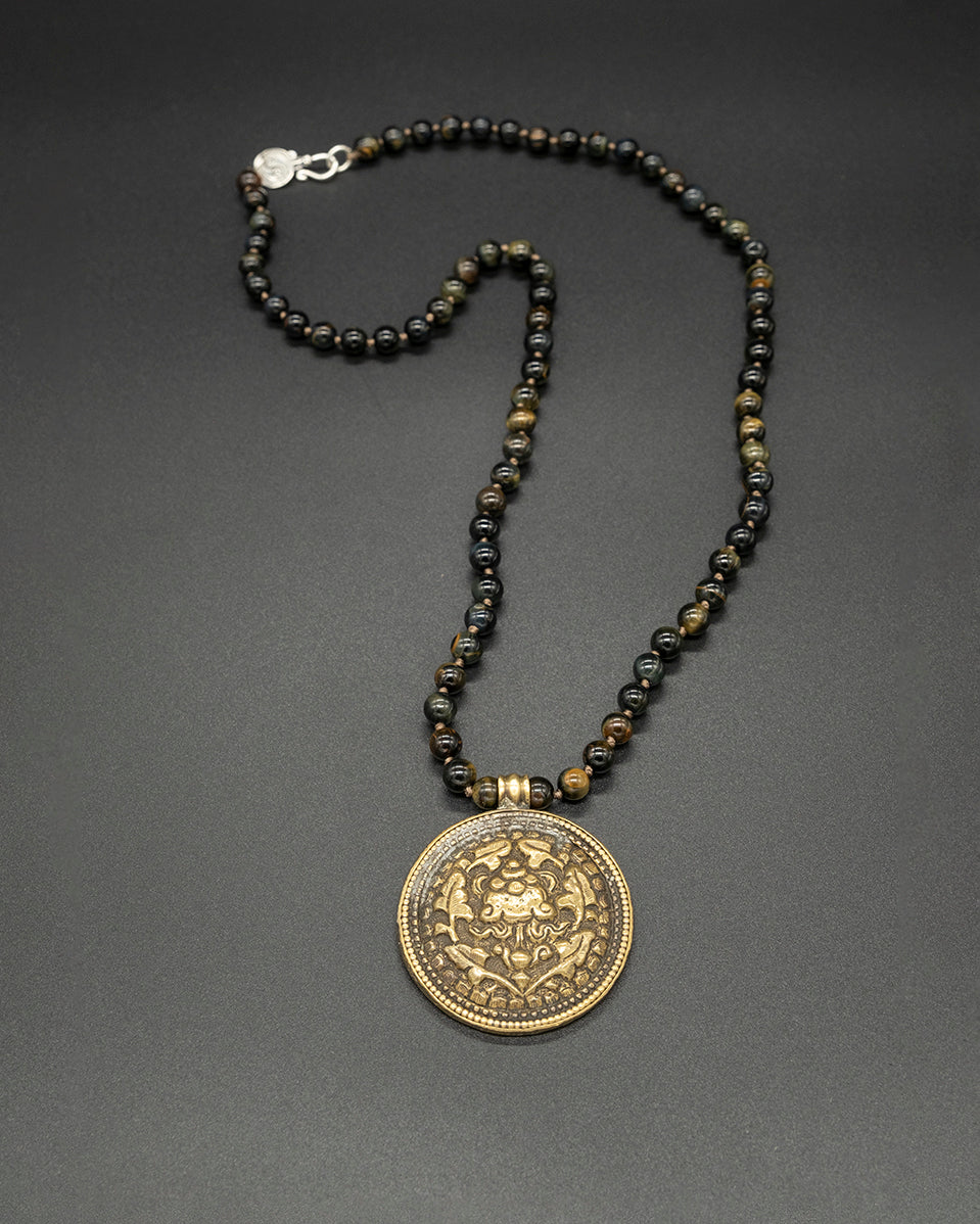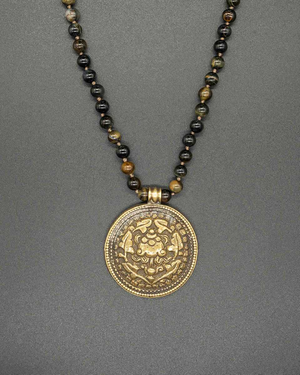 This vintage brass pendant captures a rich history with its intricate designs. The pendant hangs from a hand-knotted tiger eye chain.