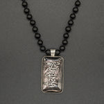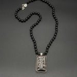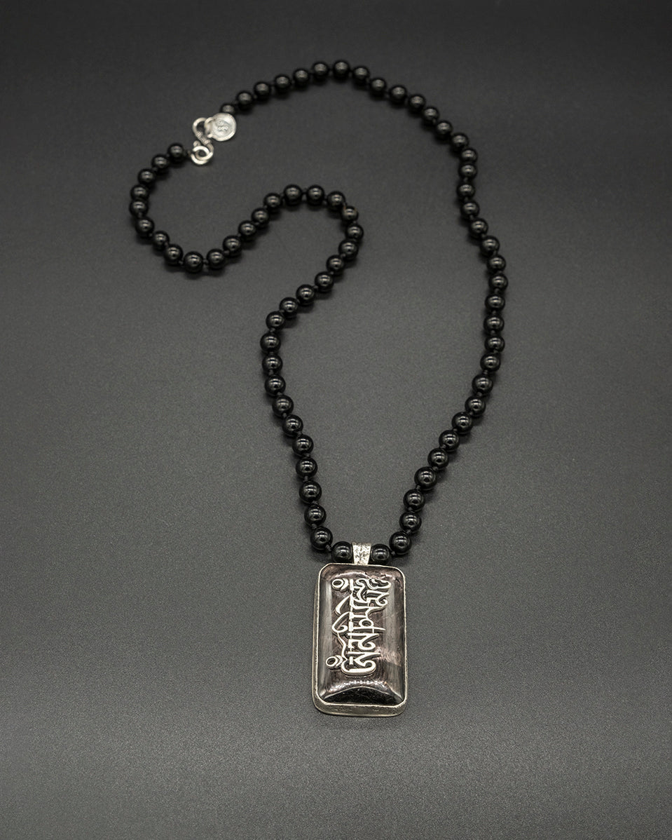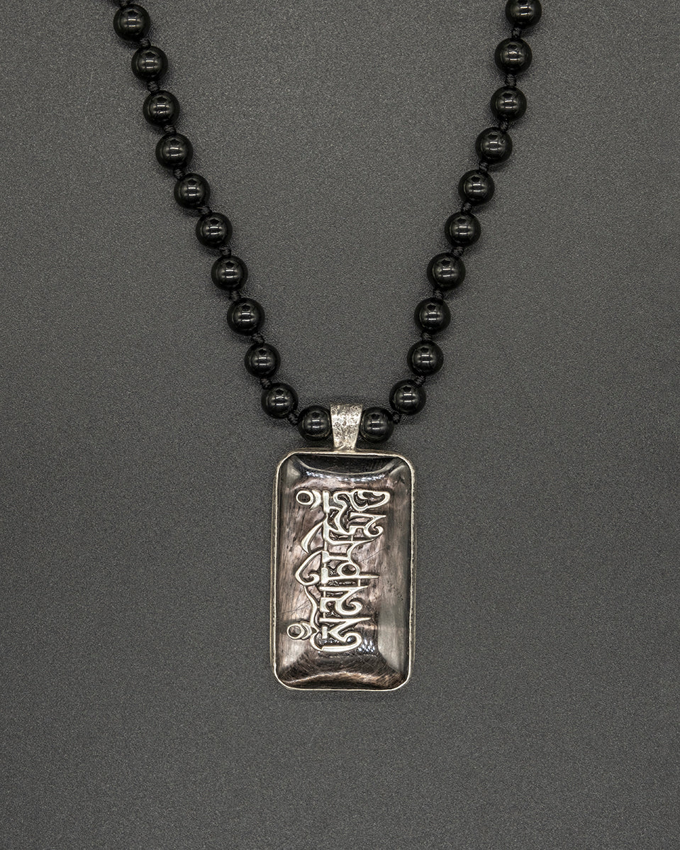 Seek harmony and balance in your life with our stunning Om Mani Padme Hum stone pendant. It comprises a hypersthene stone delicately dusted with silver that evokes a sense of serenity and purity. This piece carries the Om Mani Padme Hum symbol, reflecting the heart of Buddha's teachings elegantly hanging on a black tourmaline chain.