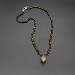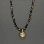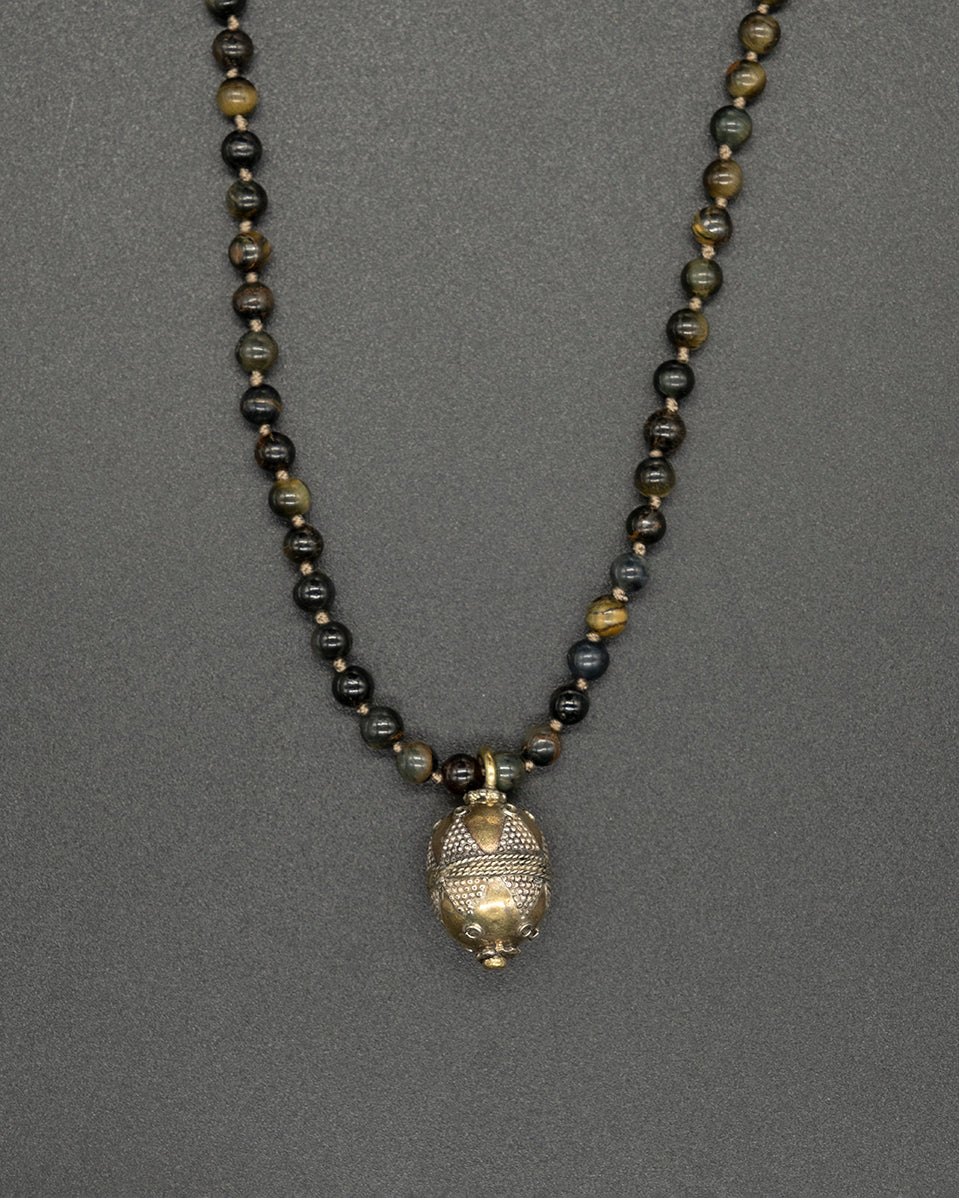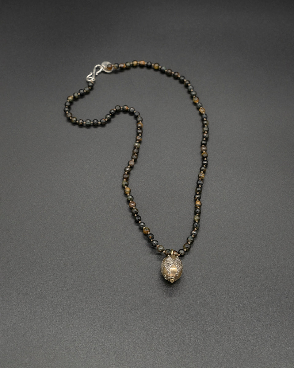 Step into the mystical world of Tibet with our Petite Golden necklace. This enchanting piece showcases an authentic vintage brass ball, representing the rich heritage of Tibetan craftsmanship. The centerpiece is paired with a tiger eye bead chain.