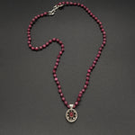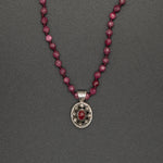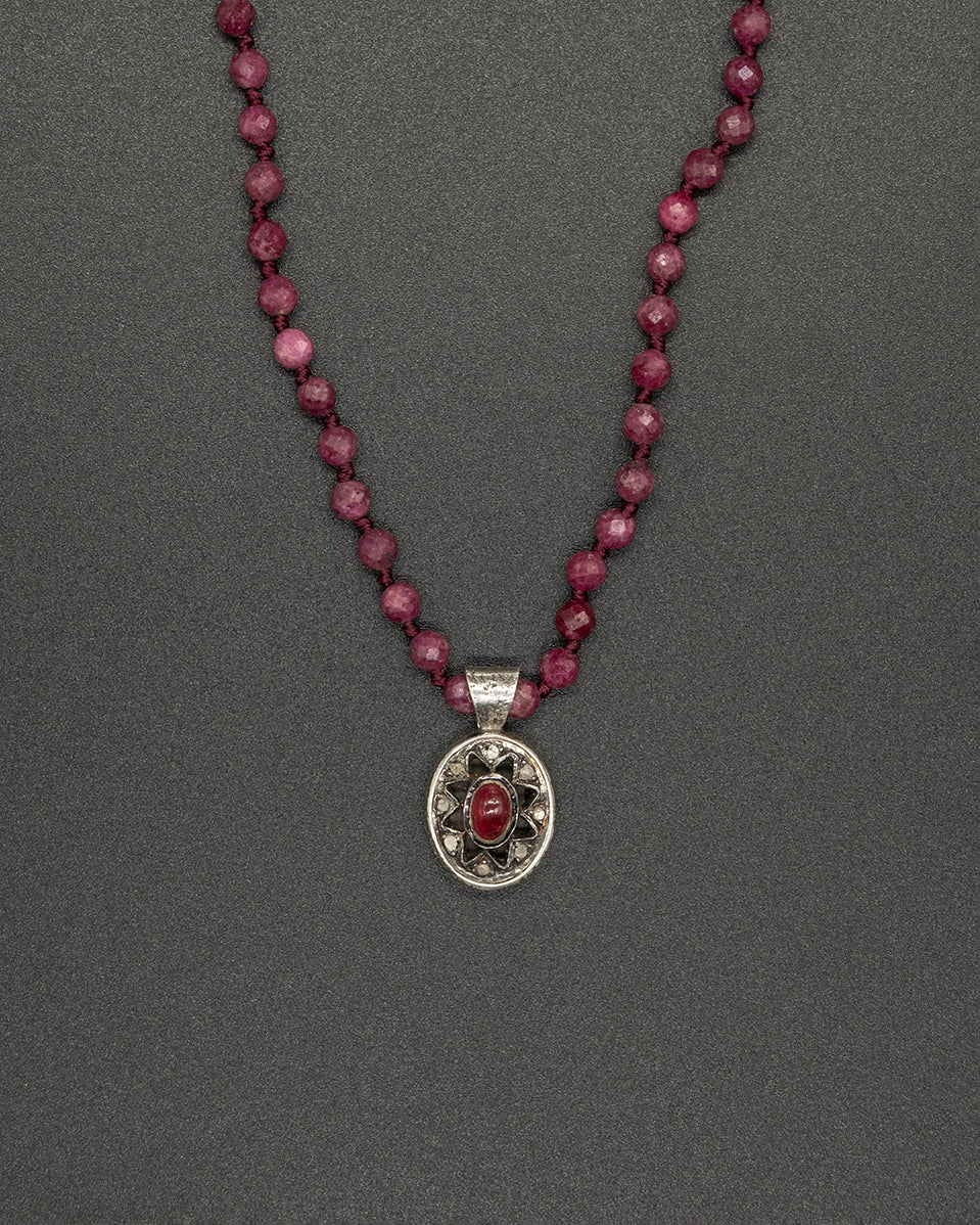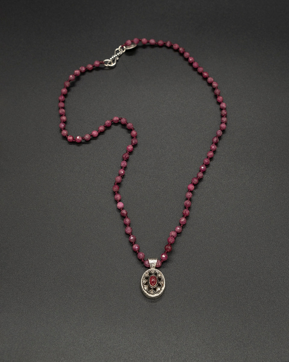 Featuring a luminous sterling silver pendant, embedded by a dazzling diamond & ruby star, this necklace exudes ethereal beauty. The ruby chain catches the light as you move, creating an enchanting glow.