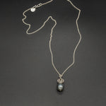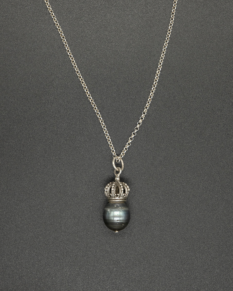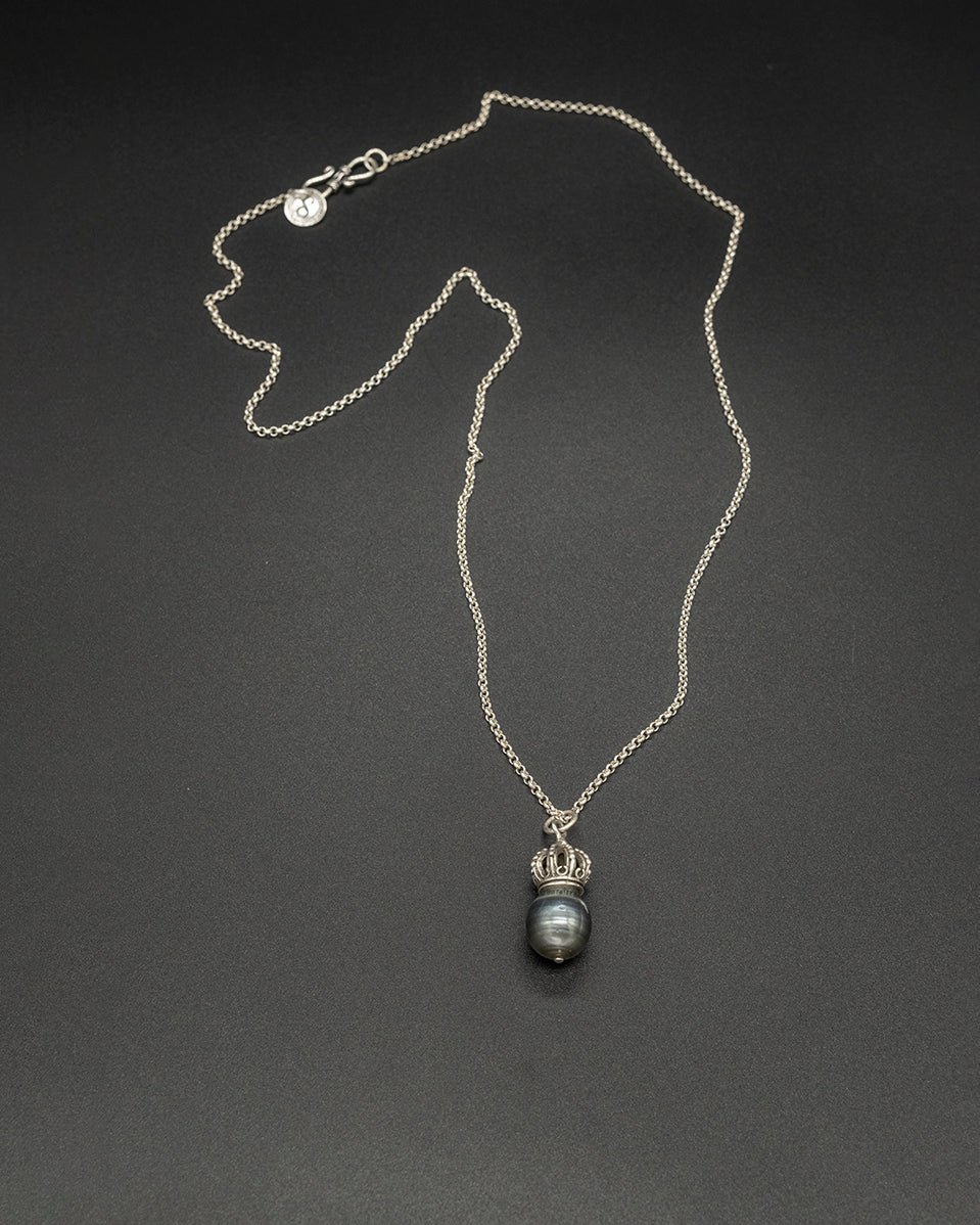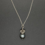 Adorned with a striking drop of Tahitian pearl with silver crown, this pendant on its silver chain is enchanting. The captivating blend of dark elegance and radiant brilliance makes this necklace a versatile and cherished piece.