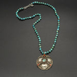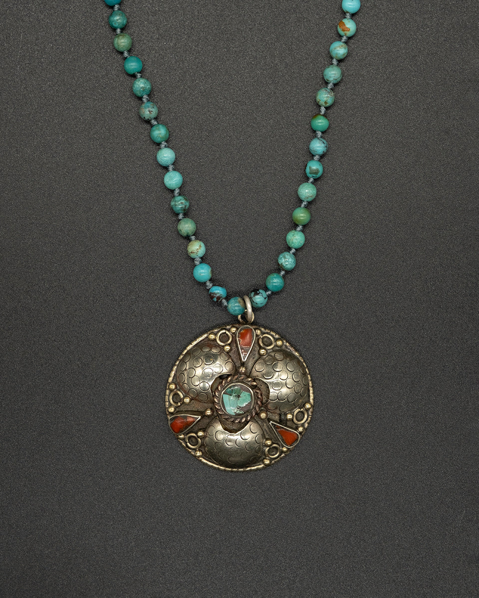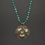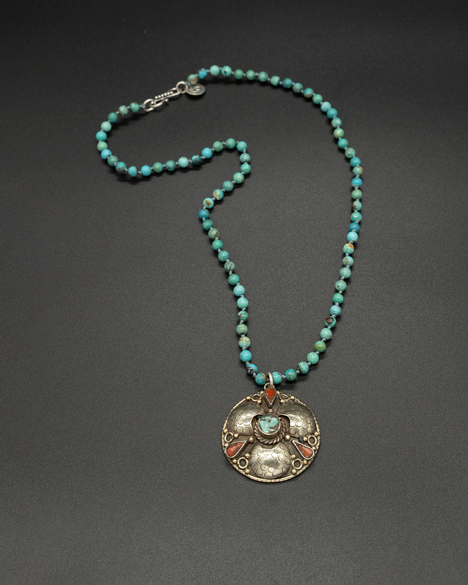 This vintage coral & turquoise silver pendant is full of striking hues. The unique circular pendant is flawlessly paired with a hand knotted Arizona turquoise chain.