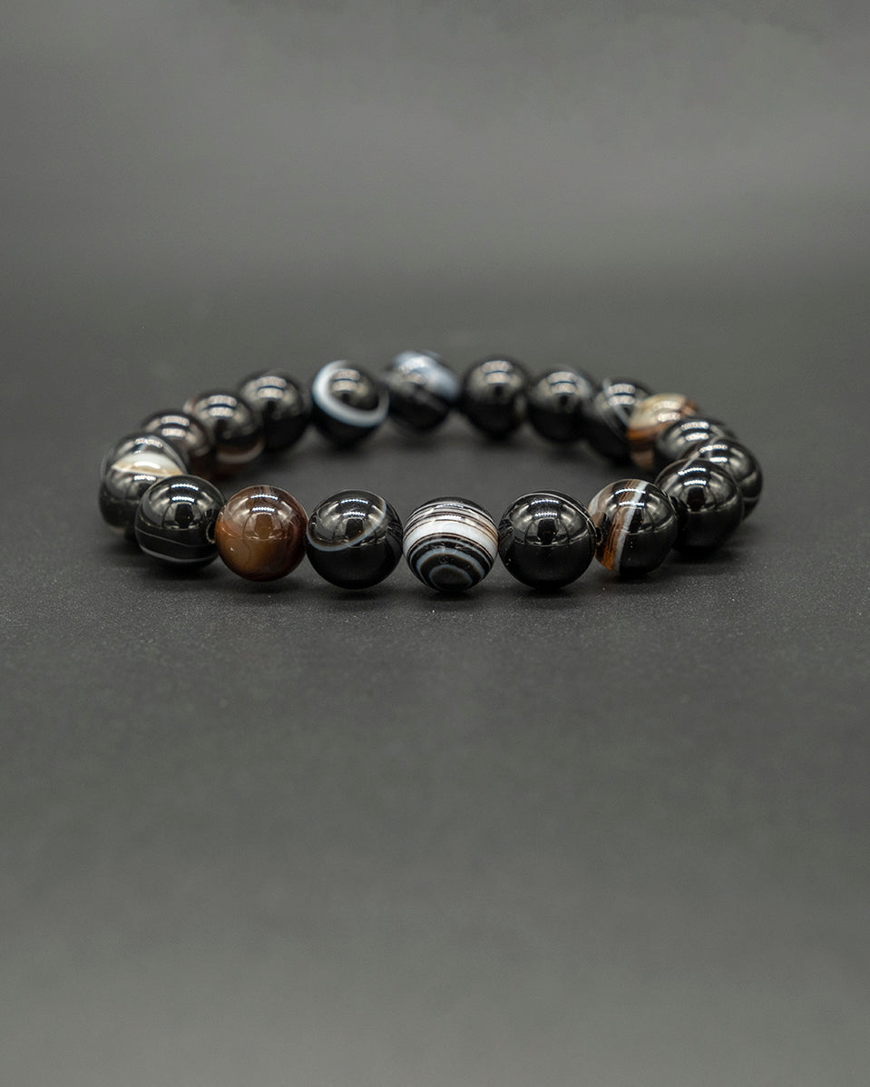 Striking Suleimani eye agate beads with their natural banded patterns, creating a protective, timeless piece made for effortless daily wear.
