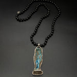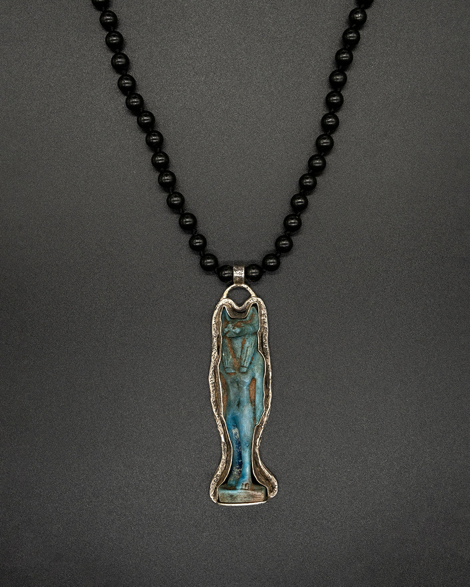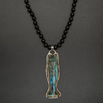 Transport yourself to ancient Egypt with this vintage carved Anubis figure, delicately framed in textured silver. Each detail of this handcrafted piece speaks to the rich history and mythology of this iconic god of mummification and the afterlife. The pendant is displayed on a hand-knotted opal chain.