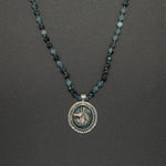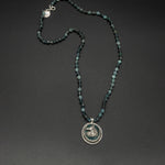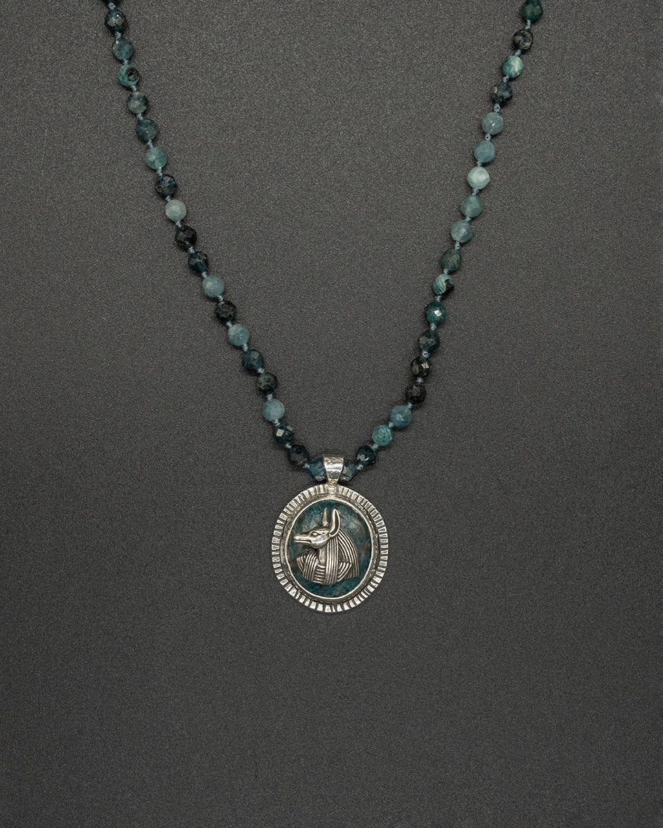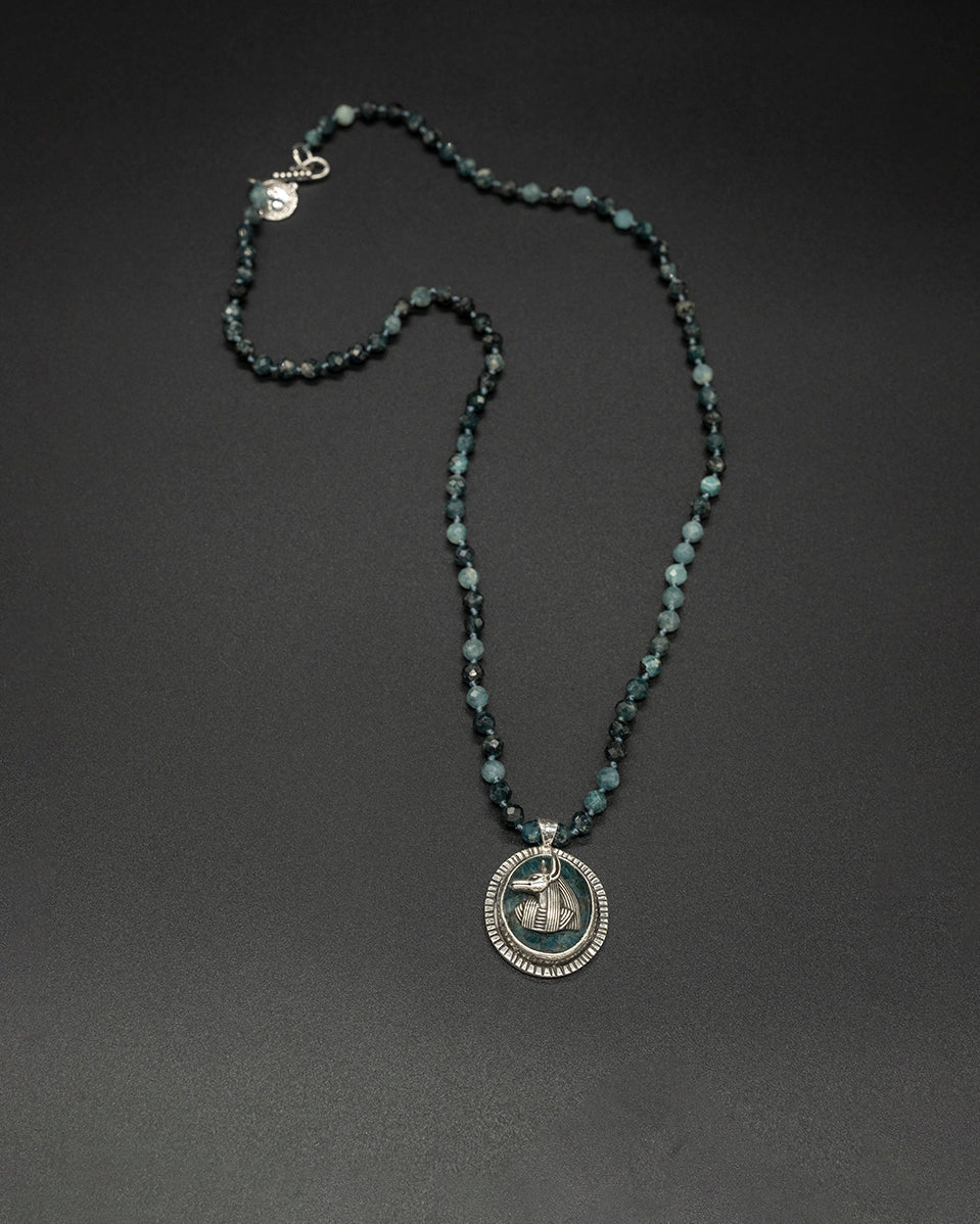 A silver Anubis pendant set with vibrant apatite, paired with a blue tourmaline chain. A striking piece with bold symbolism, clear energy, and refined artisan detail.