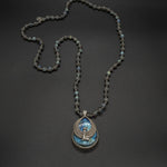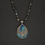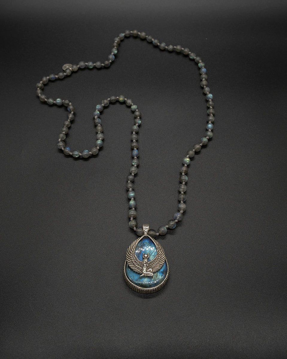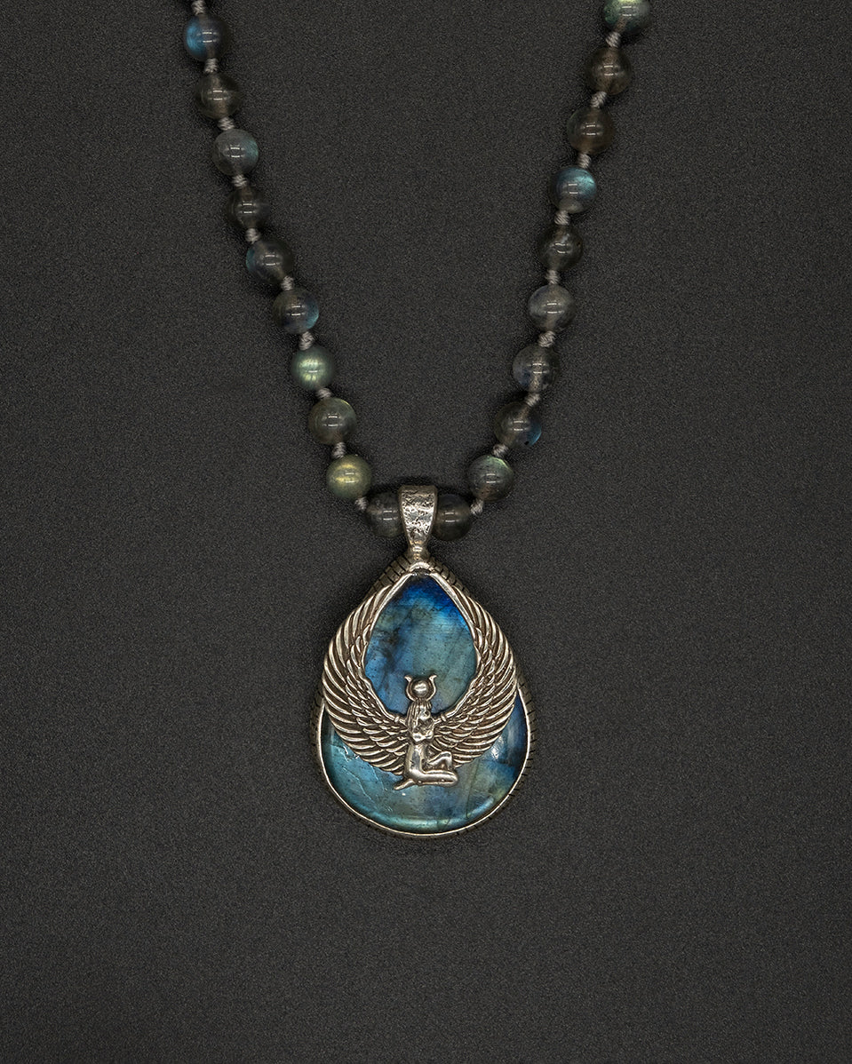 Embrace the essence of the revered Ancient Egyptian goddess Isis with our labradorite pendant. This piece is crafted with silver-framed, shimmering labradorite that embodies the captivating allure of the goddess herself. In the heart of this pendant lies a silver Isis emblem that serves as a quiet yet profound homage to the goddess of fertility, motherhood, magic, death, healing, and rebirth. The pendant is strung on a labradorite chain.