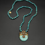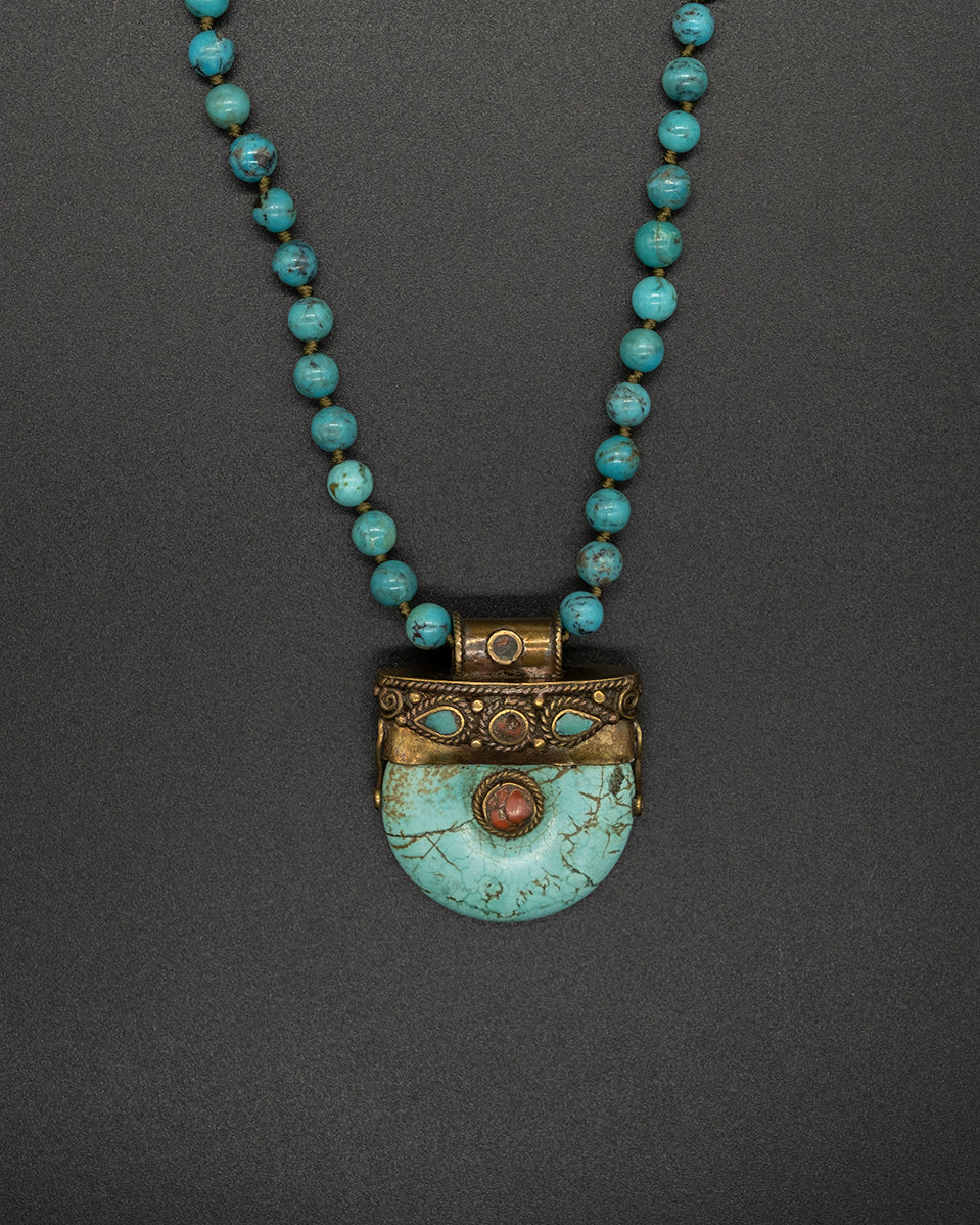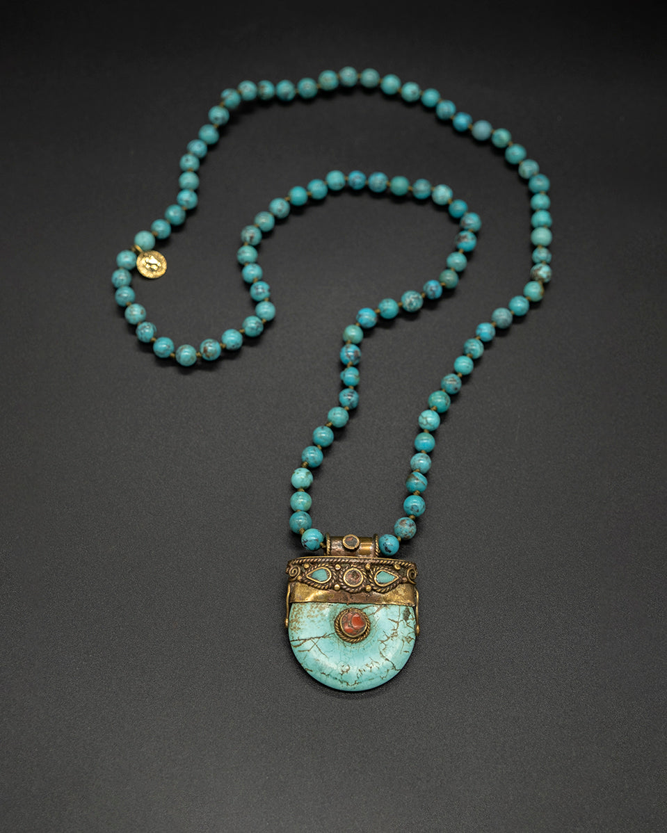 Introduce a warm, earthy accent with this vintage turquoise brass pendant. Set with natural turquoise, coral and paired with an Arizona turquoise chain, it reflects a timeless, handcrafted spirit.