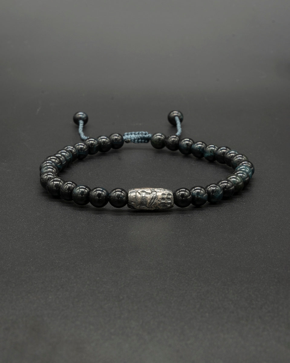 Deep blue tiger eye beads accented with a handcrafted silver-stamped bead — bold, protective, and effortlessly stylish.