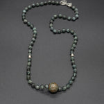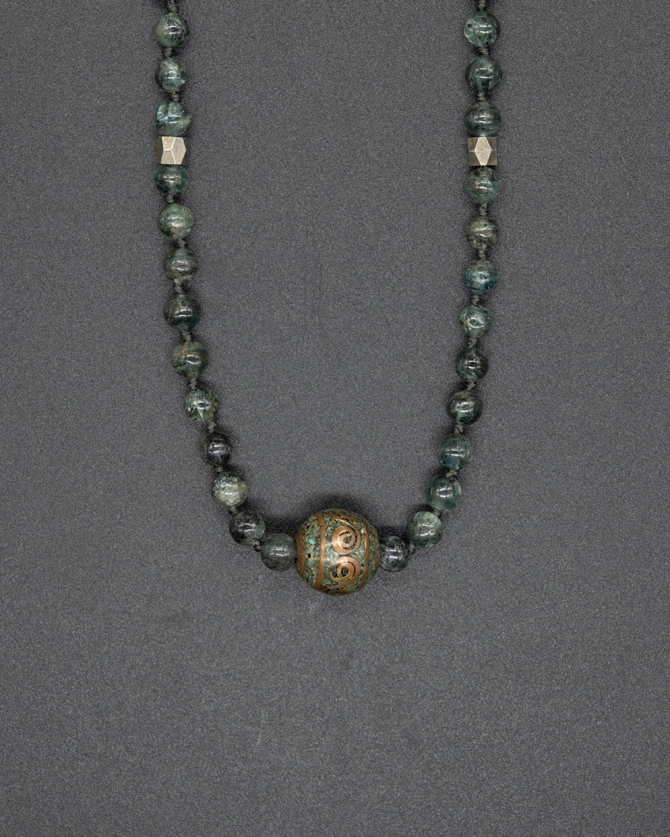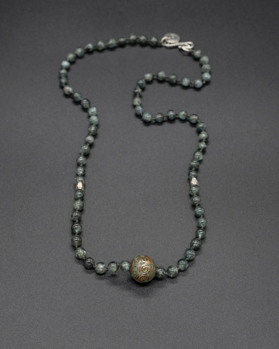Step into the mystical world of Tibet with our brass ball kyanite. This enchanting piece showcases an authentic vintage brass ball accented with turquoise, representing the rich heritage of Tibetan craftsmanship. The centerpiece is paired with a kyanite and brass bead chain.