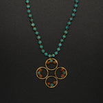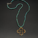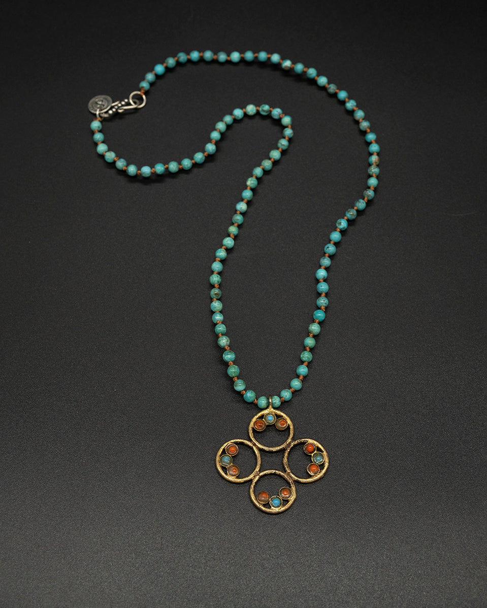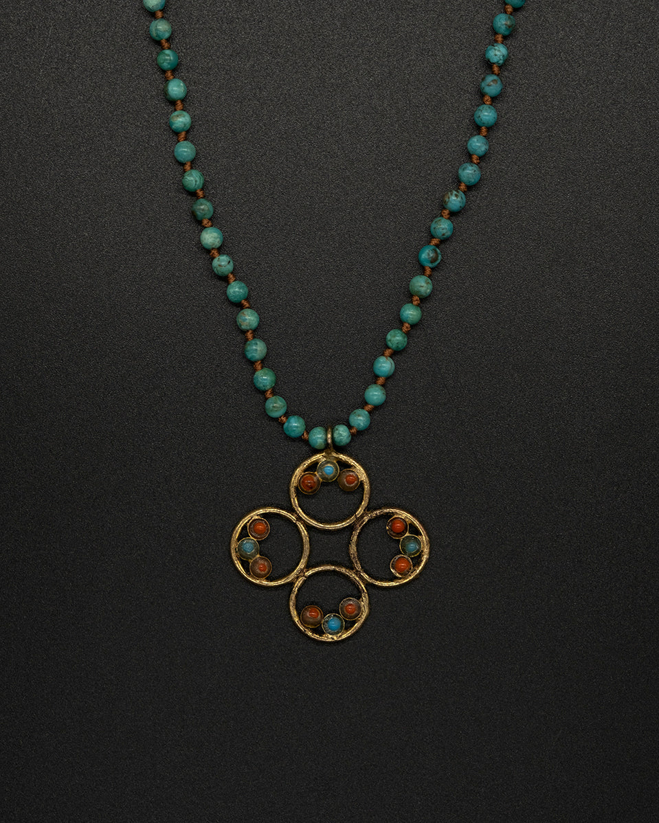 A warm vintage brass pendant accented with natural coral and turquoise, paired with a rich Arizona turquoise chain. Earthy, bold, and full of character—bringing together heritage tones and vibrant desert blues in a timeless, handcrafted style.