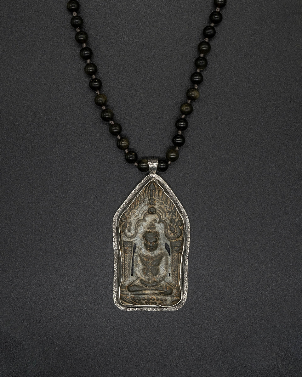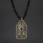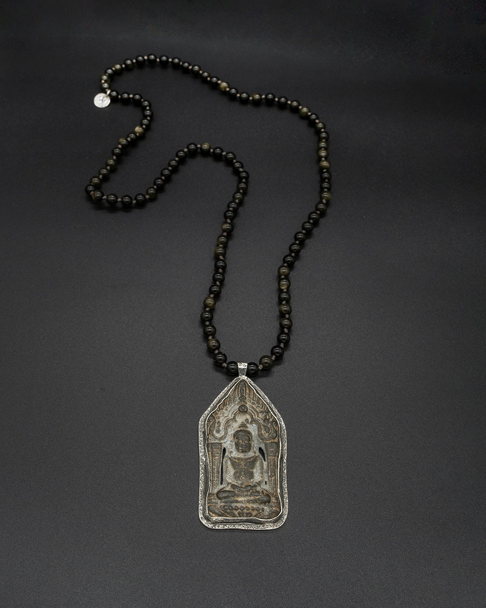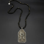 This vintage Buddha is delicately framed with silver and encapsulates the timeless beauty of the Buddha. Suspended on a hand-knotted obsidian chain, it emits a captivating aura of peace and spirituality.