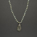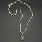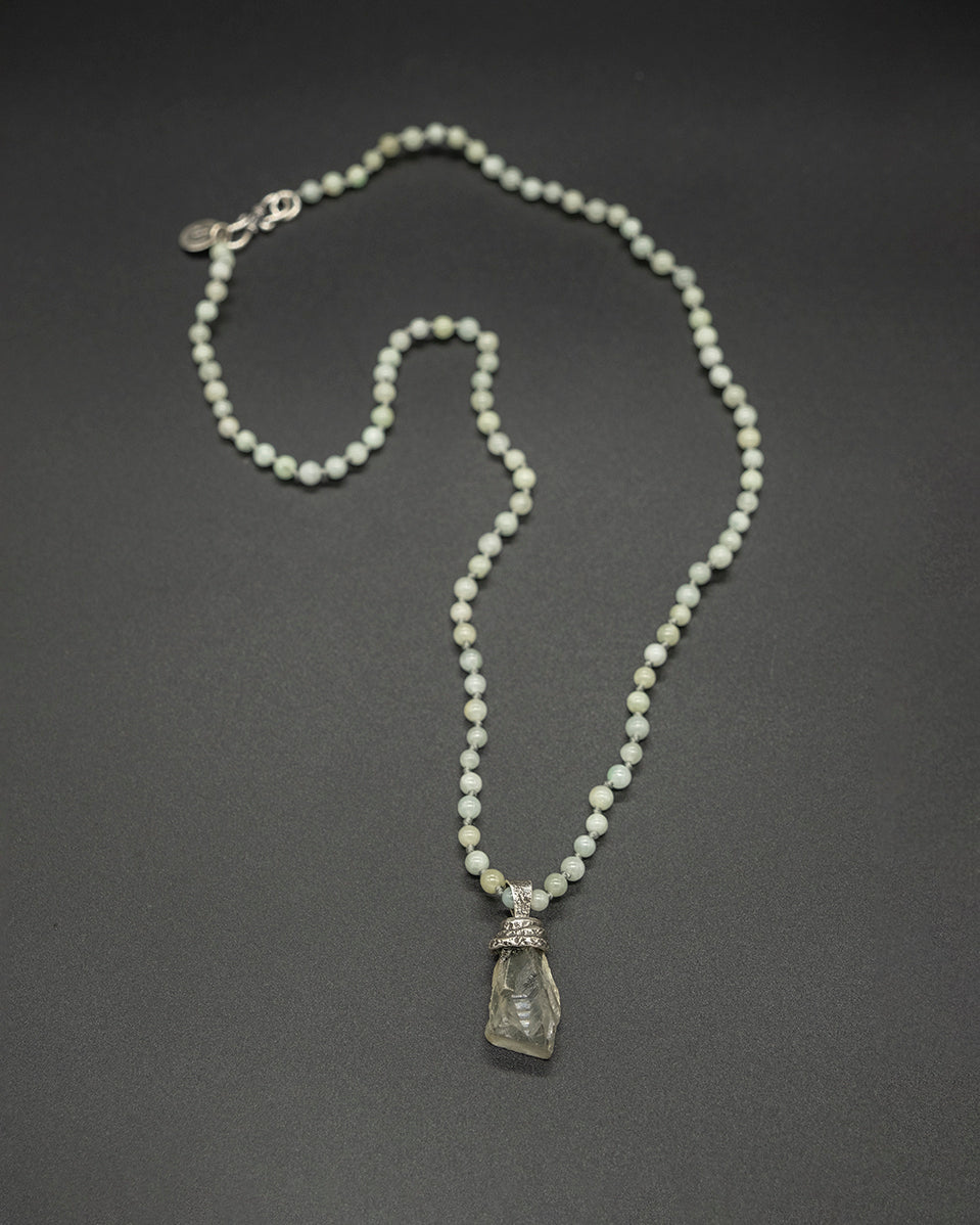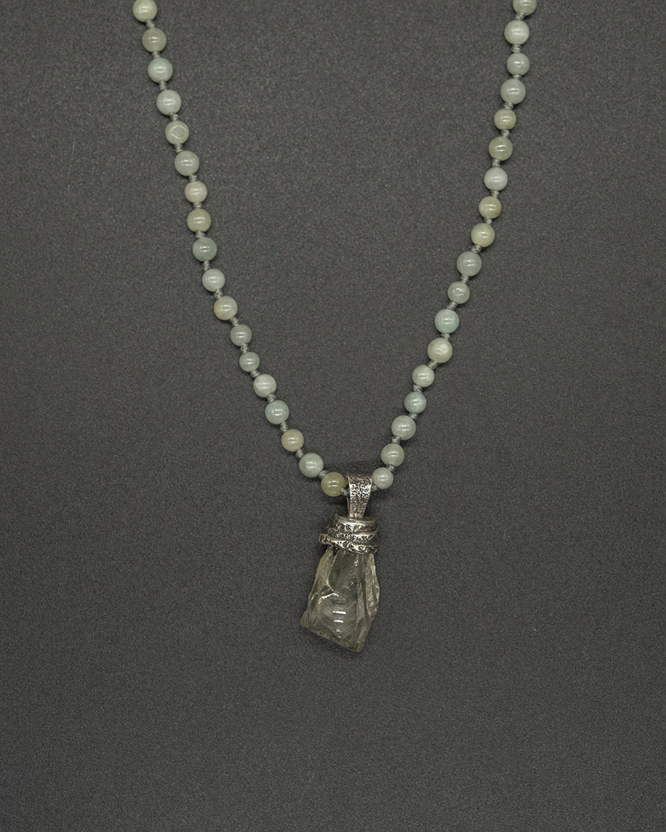 Burma Quartz wrapped in textured silver, accompanied by a Burma jade chain. A piece that radiates clarity and strength, harnessing the amplifying energy of quartz and the grounding power of jade — a talisman for protection, insight, and inner resilience.