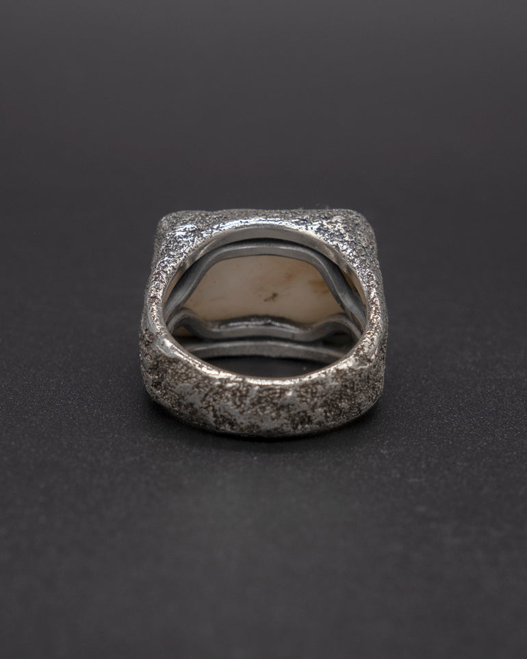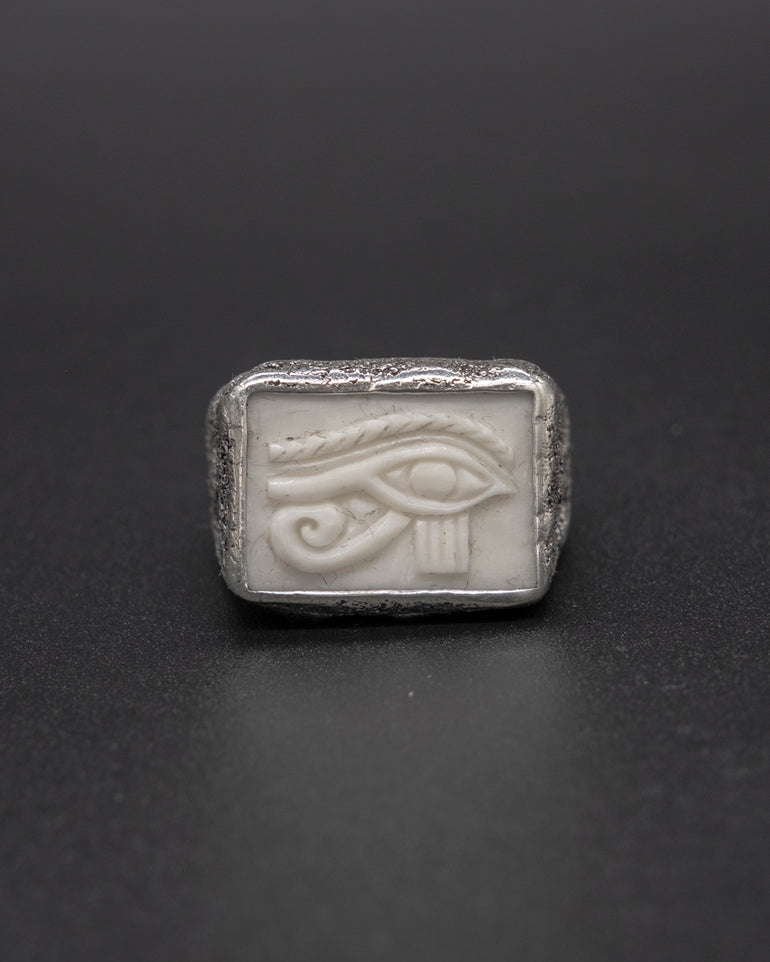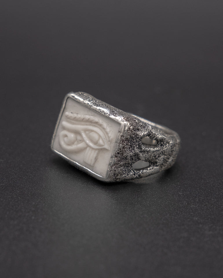 Meticulously carved in Bali from bone, every detail of this ancient symbol is brought to life. The dusted sterling silver ring creates a perfect backdrop for the Eye of Ra, which is known for sun, light and power.