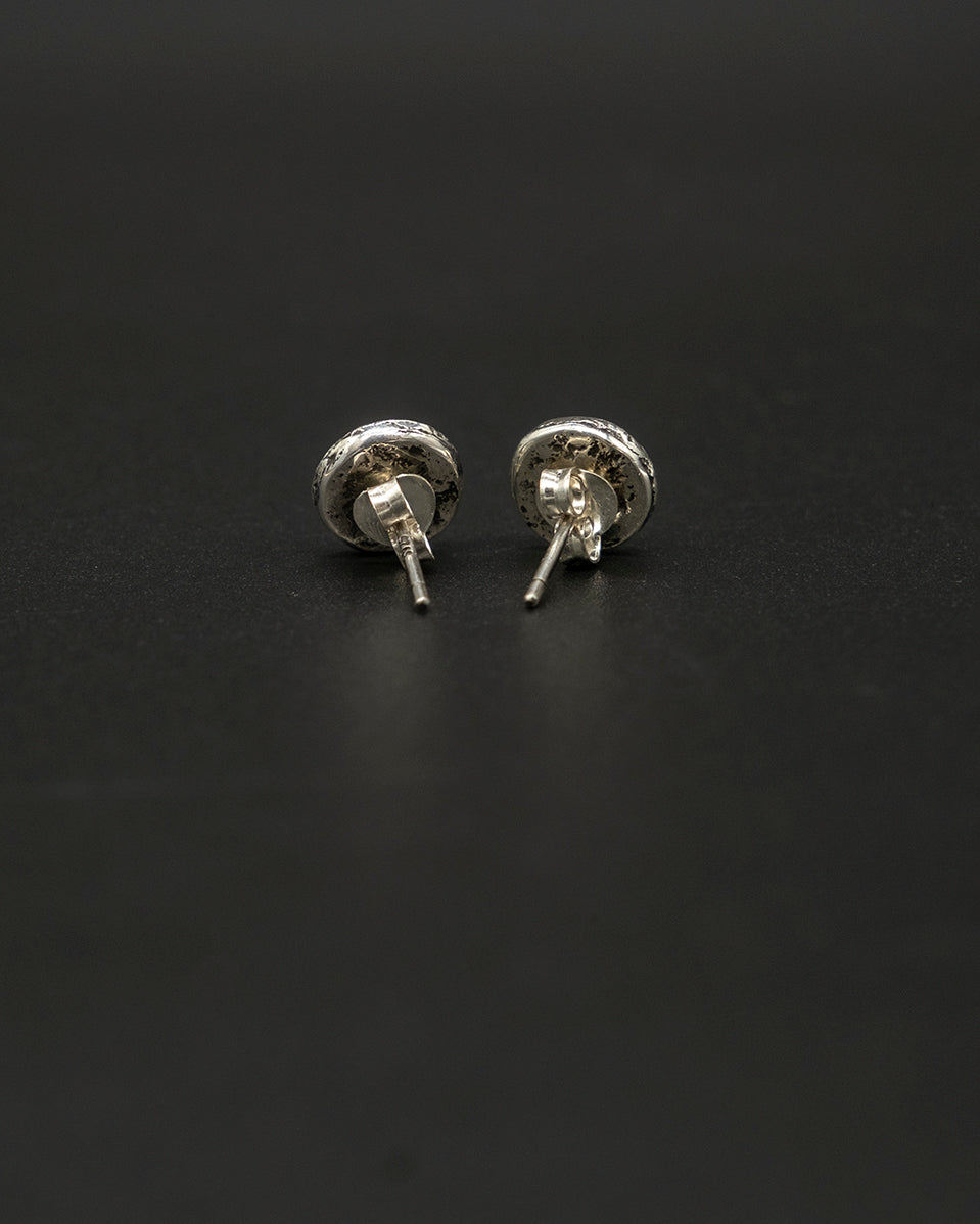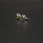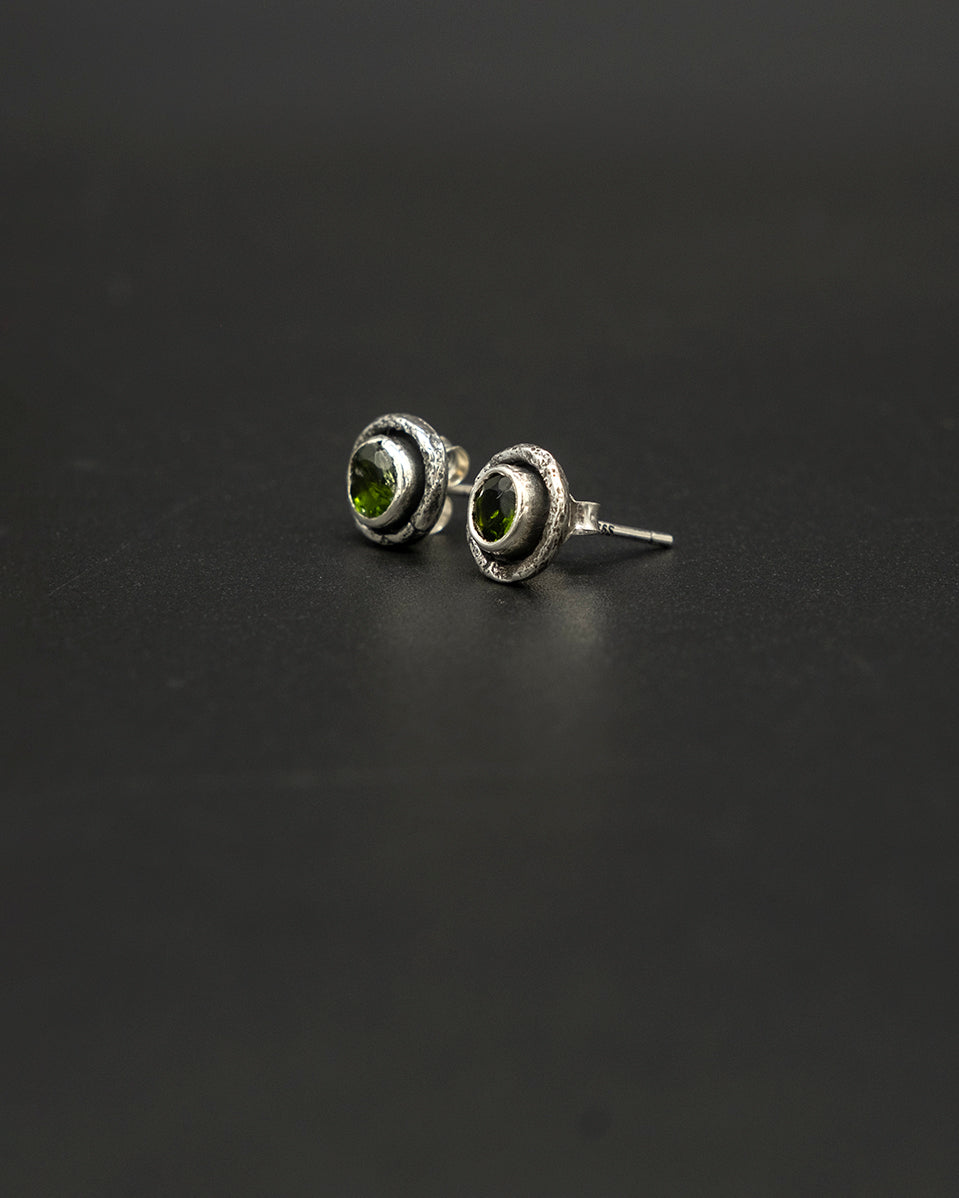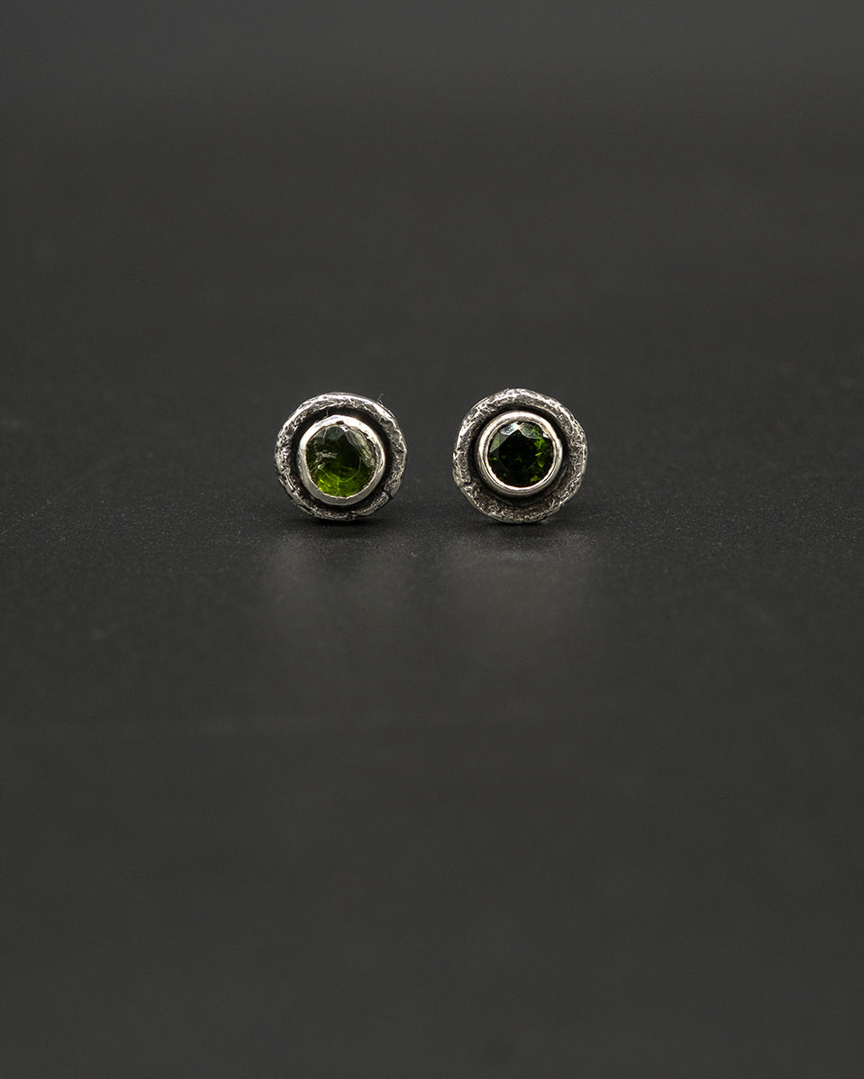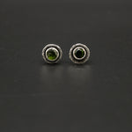 Natural green diopside set in hand-textured silver studs. Each pair shows rich green tones with unique stone character, complemented by artisan-made silver detailing.