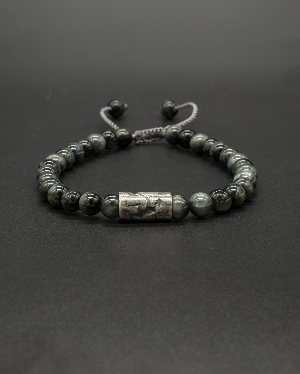 Smoky eagle eye beads paired with a vintage-stamped accent bead, creating a grounded and timeless piece with subtle character and everyday elegance.