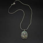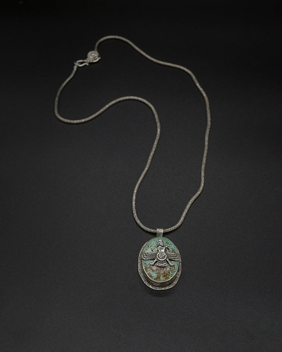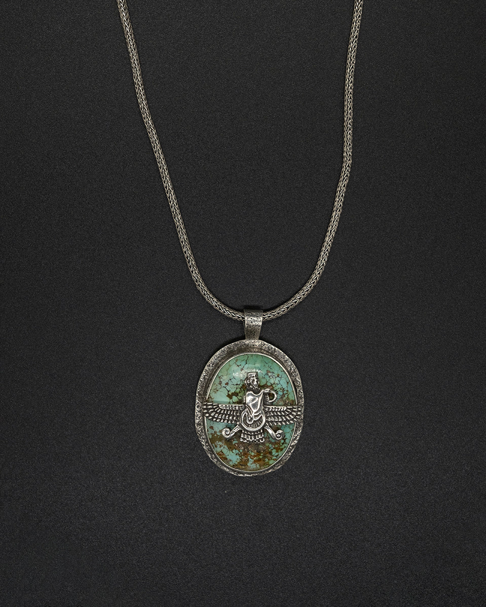 This piece is more than just a piece of jewelry – it carries a powerful reminder of the Farvahar’s importance in culture and history. This pendant is made from Persian turquoise, delicately framed in a dusted silver setting. Adorned with a prominent farvahar emblem, it represents good thoughts, good words, good deeds. Wear it with the matching silver snake chain for a unique and beautiful look.