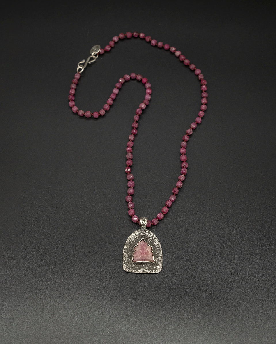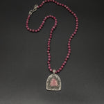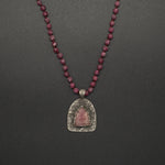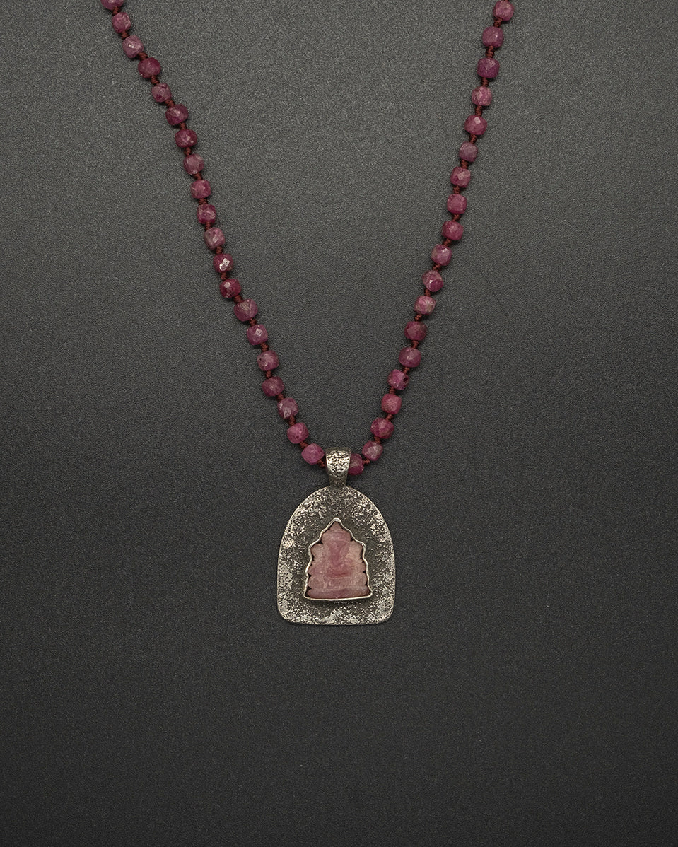 At the heart of the pendant, a beautifully hand-carved ruby Ganesha symbol serves as a constant reminder of growth, wisdom, and prosperity. The Ganesha symbol is encased in silver and hanging on a hand-knotted ruby chain.