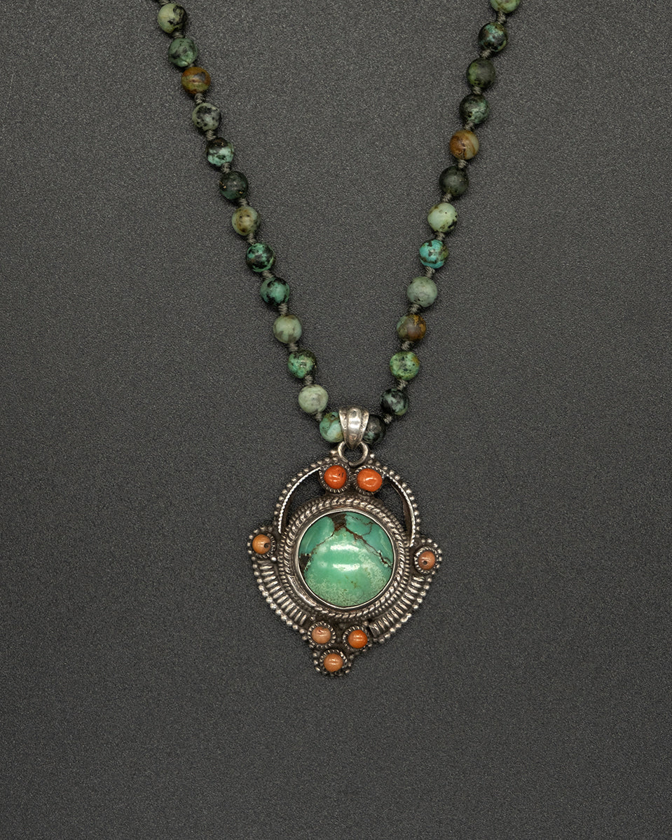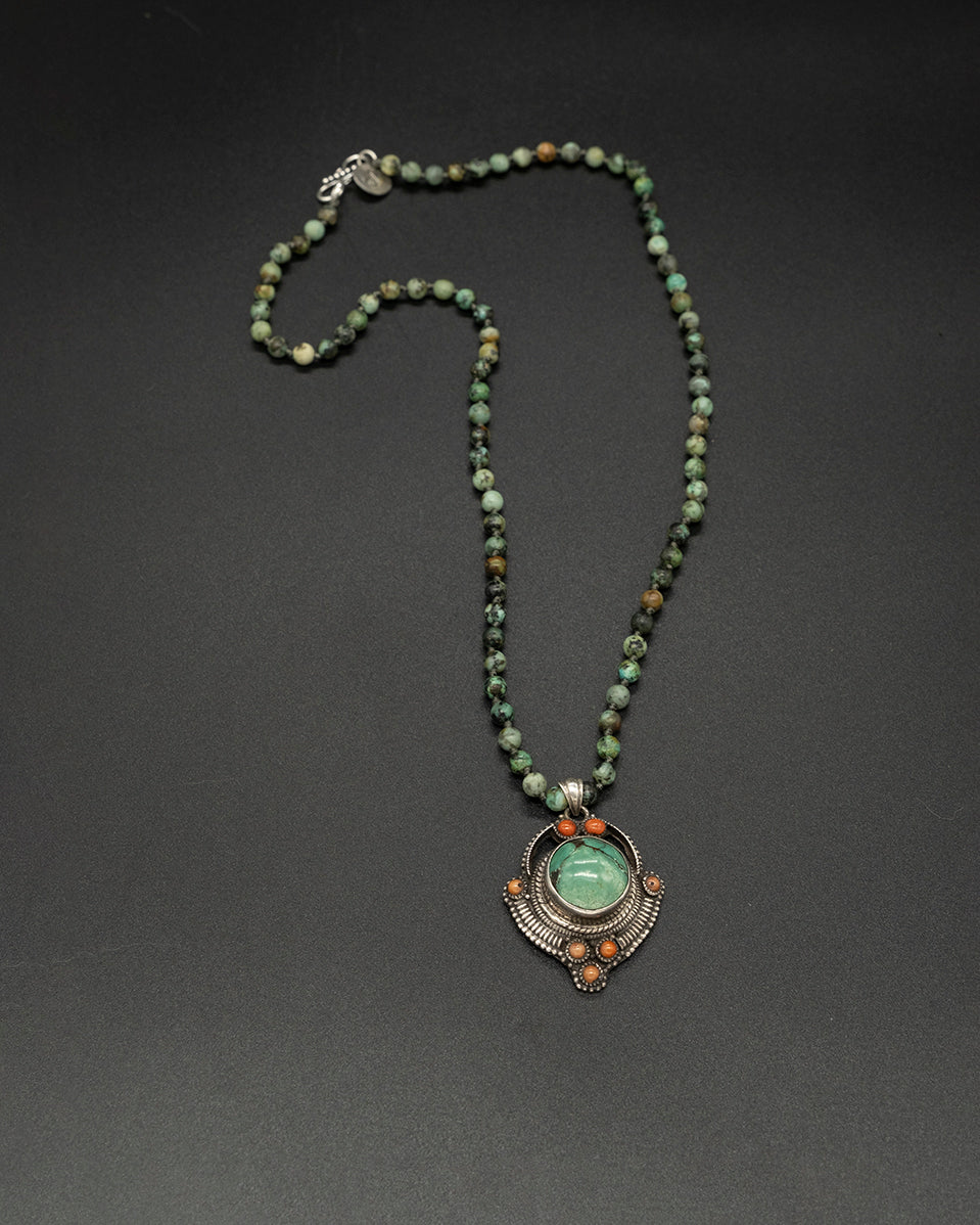 Add a vibrant earthy accent with this coral & green turquoise pendant. Paired with an African turquoise chain, it brings rich color, natural texture, and a timeless handcrafted feel.