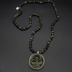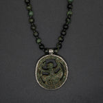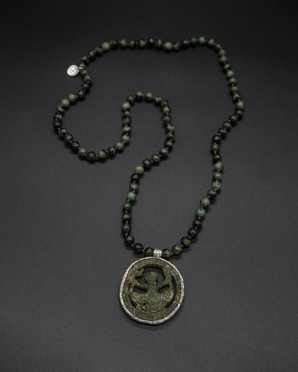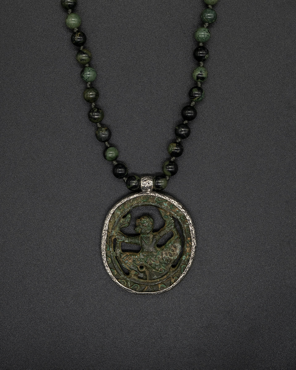 This vintage bronze Hanuman symbol is encased in silver and suspended from a hand-knotted Kumba jasper chain. Lore suggests this symbol of devotion to honesty and loyalty will provide strength and power.