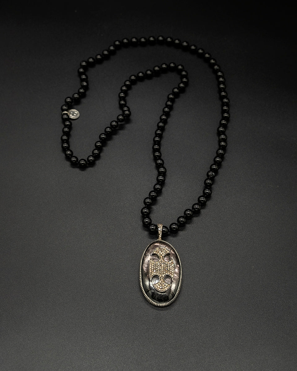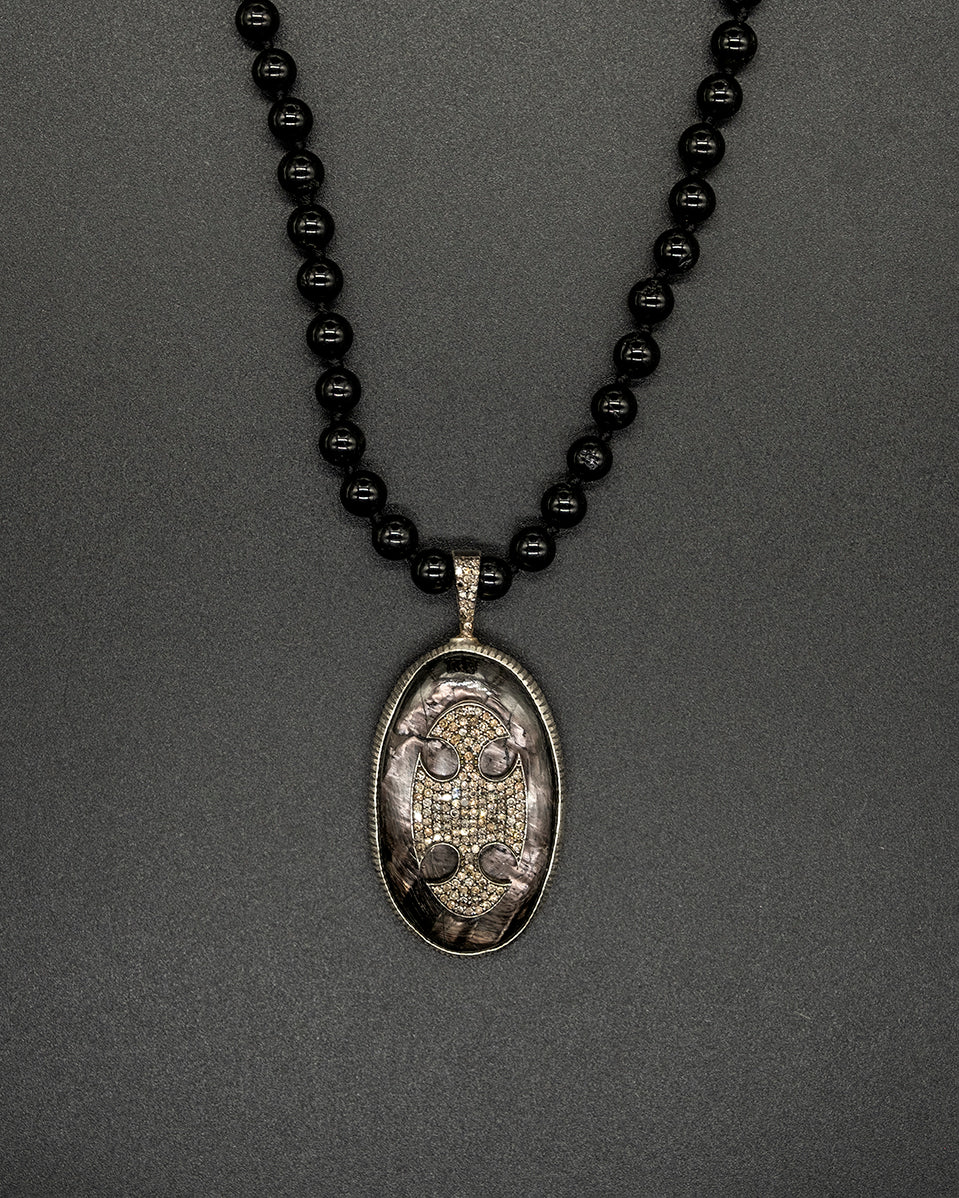 Embrace the complementary forces of life with this unique pendant. This piece symbolizes the profound philosophy of balance and harmony, creatively expressed through diamonds and hypersthene. The pendant is perfectly matched with a hand knotted black tourmaline chain that further enhances its shine.