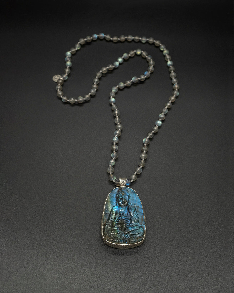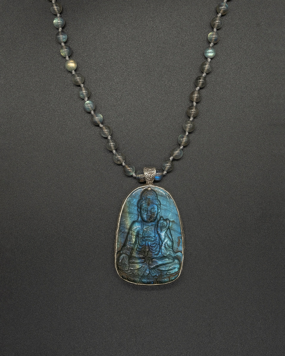 A serene carved labradorite Buddha paired with a matching labradorite bead chain.