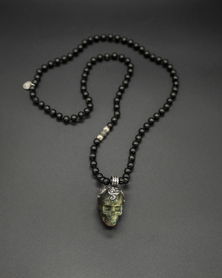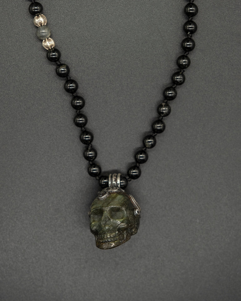 This unique piece featuring a meticulously carved labradorite Kapala skull pendant is crowned in silver, exuding an air of sophistication and mystery. The pendant hangs from a robust black tourmaline chain, accented with shimmering silver and a captivating labradorite stone, creating a harmonious blend of elegance and edge.Â