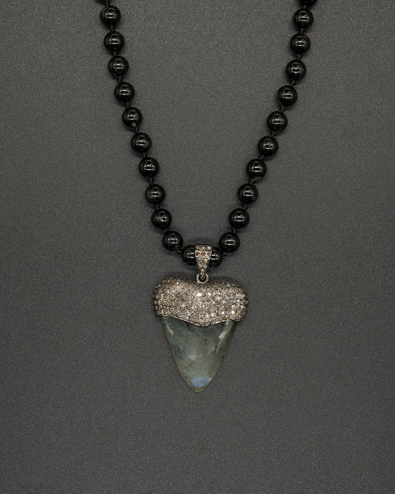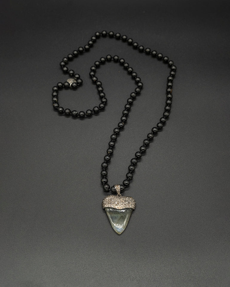 Hand-carved Labradorite pendant set with shimmering diamonds, paired with a hand-knotted Black Tourmaline chain. A creation that reflects mystery and protection, carrying the transformative light of labradorite and the grounding power of tourmaline — a balance of intuition, strength, and inner clarity.
