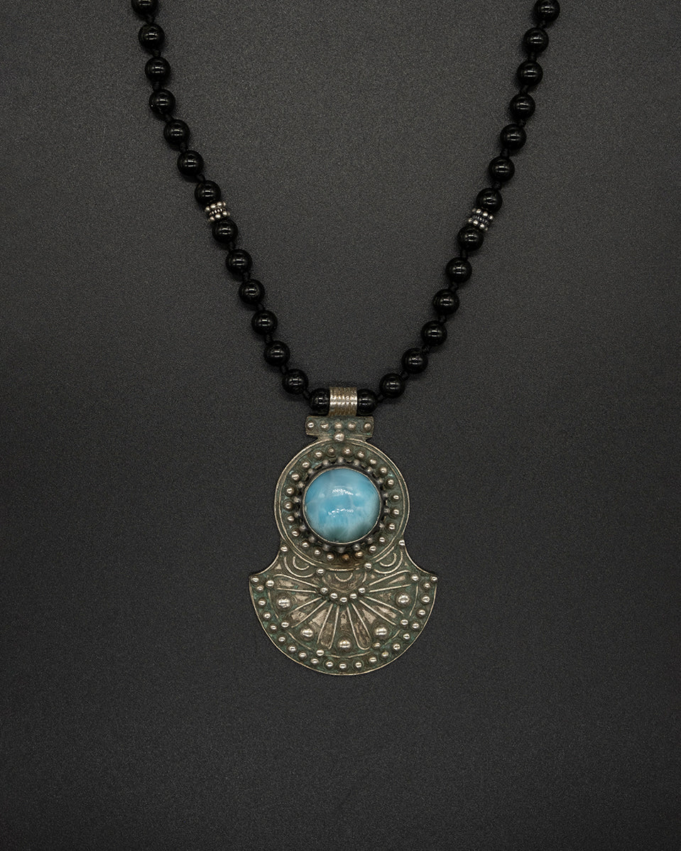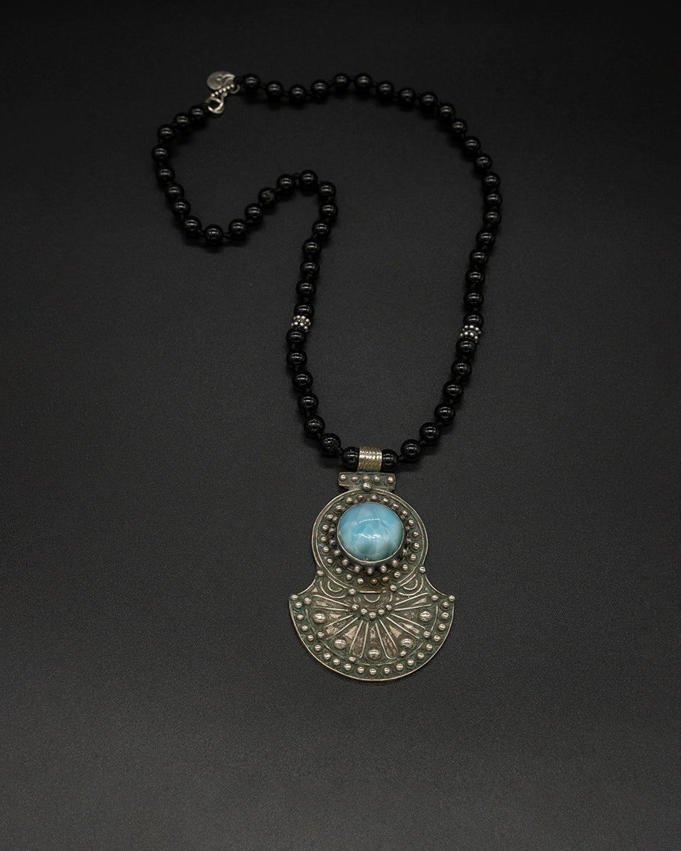 A Morocco-style silver pendant set with calming larimar, paired with a black tourmaline silver chain. A balanced piece combining soothing clarity with grounding strength in a clean, timeless design.