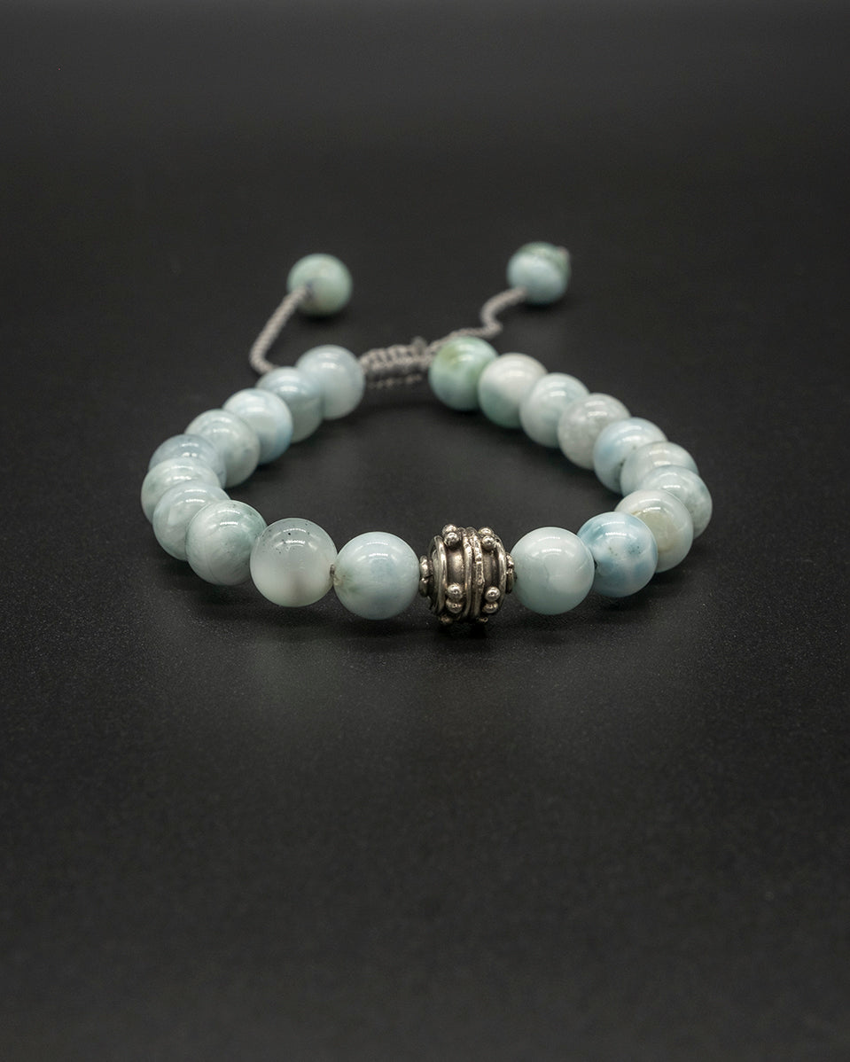 Soothing larimar beads paired with a handcrafted Balinese silver bead, creating a serene, artisanal piece with gentle ocean energy. Adjustable for an easy, comfortable fit.