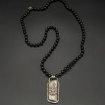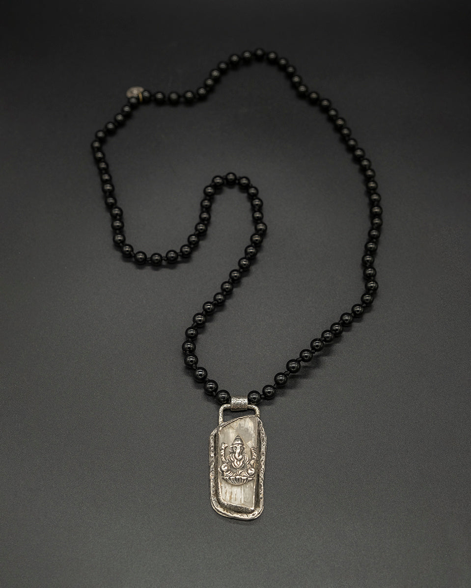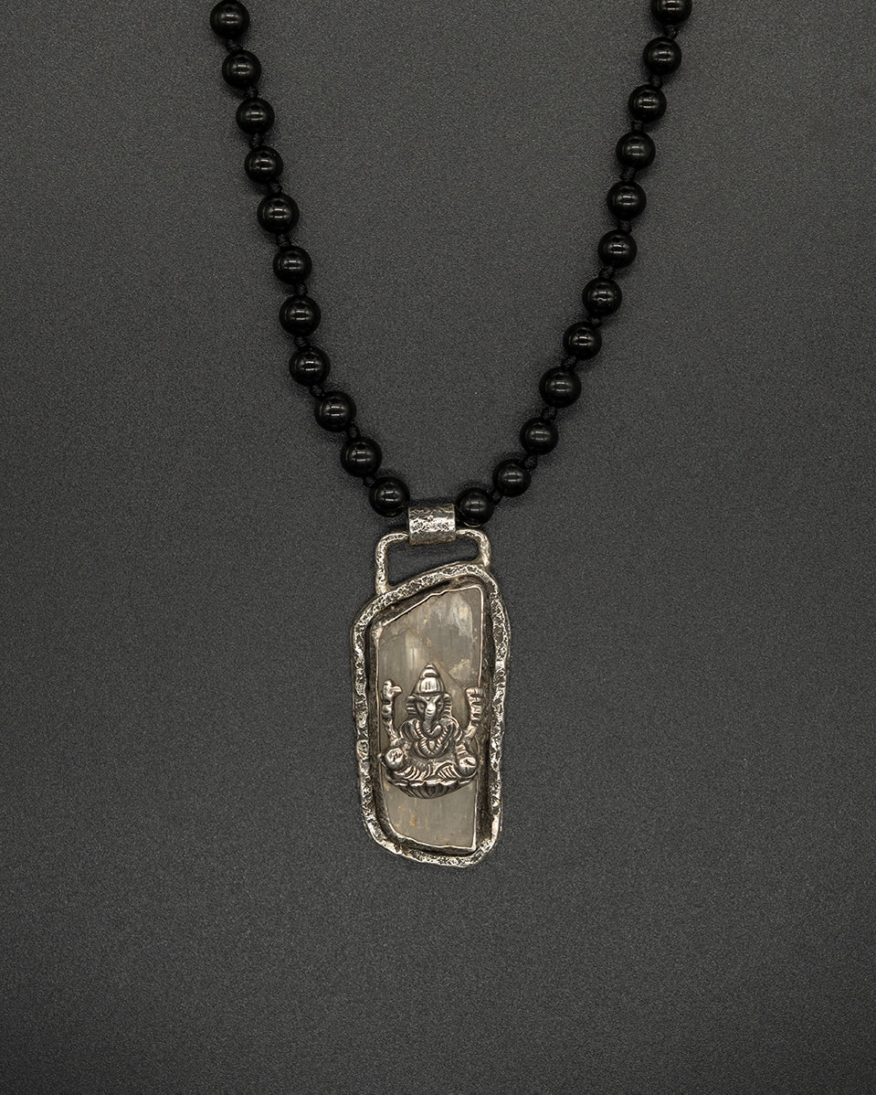 The Moonlight Ganesha pendant features a combination of moonstone and silver. This elegant piece hangs delicately on a contrasting black tourmaline chain, embodying the divine presence of Ganesha, the beloved deity known for clearing away obstacles.