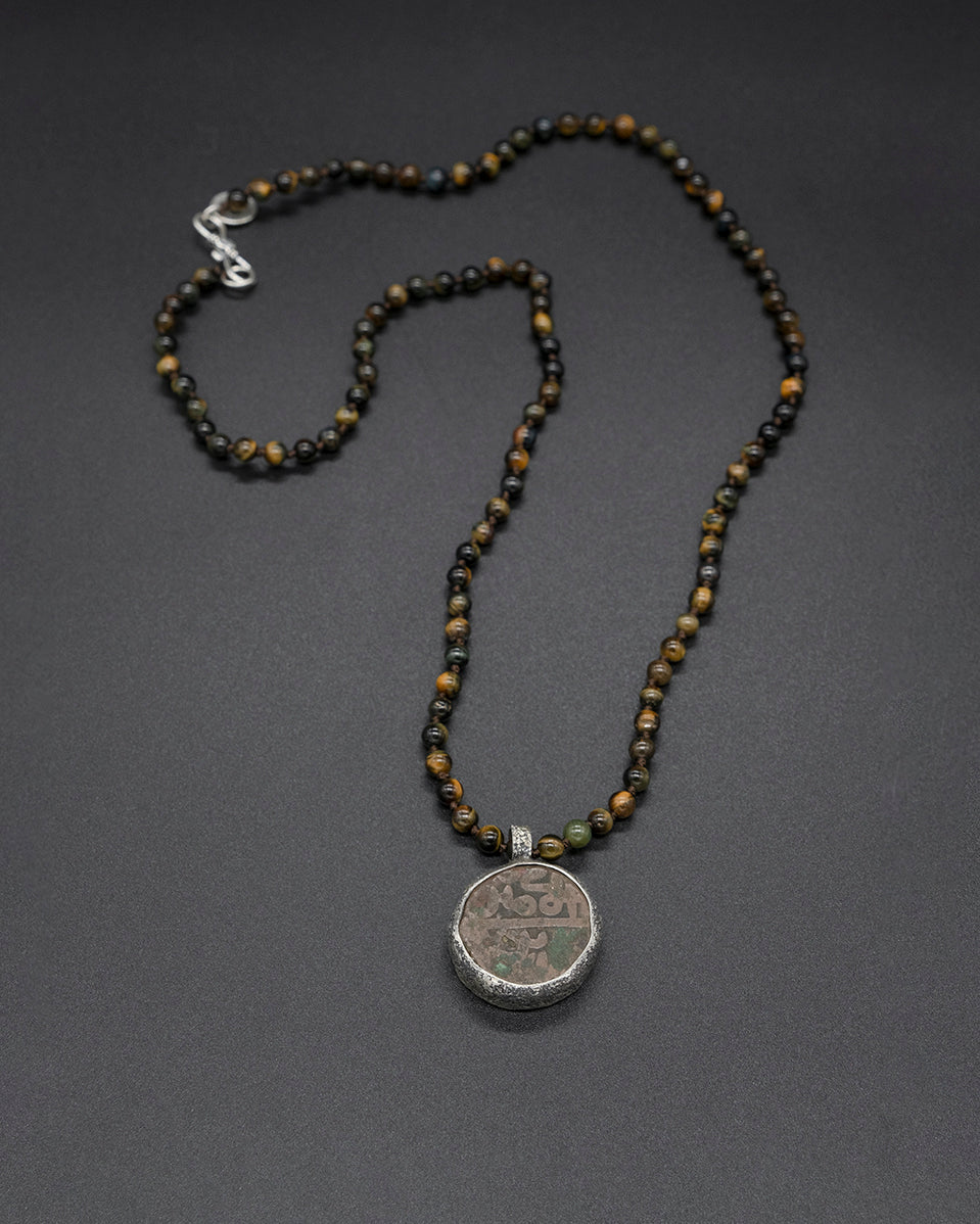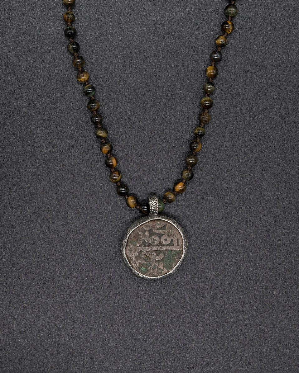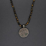 This unique piece features an authentic silver Moroccan coin, enclosed within a hand-textured silver frame and suspended from a tiger eye bead chain.
