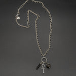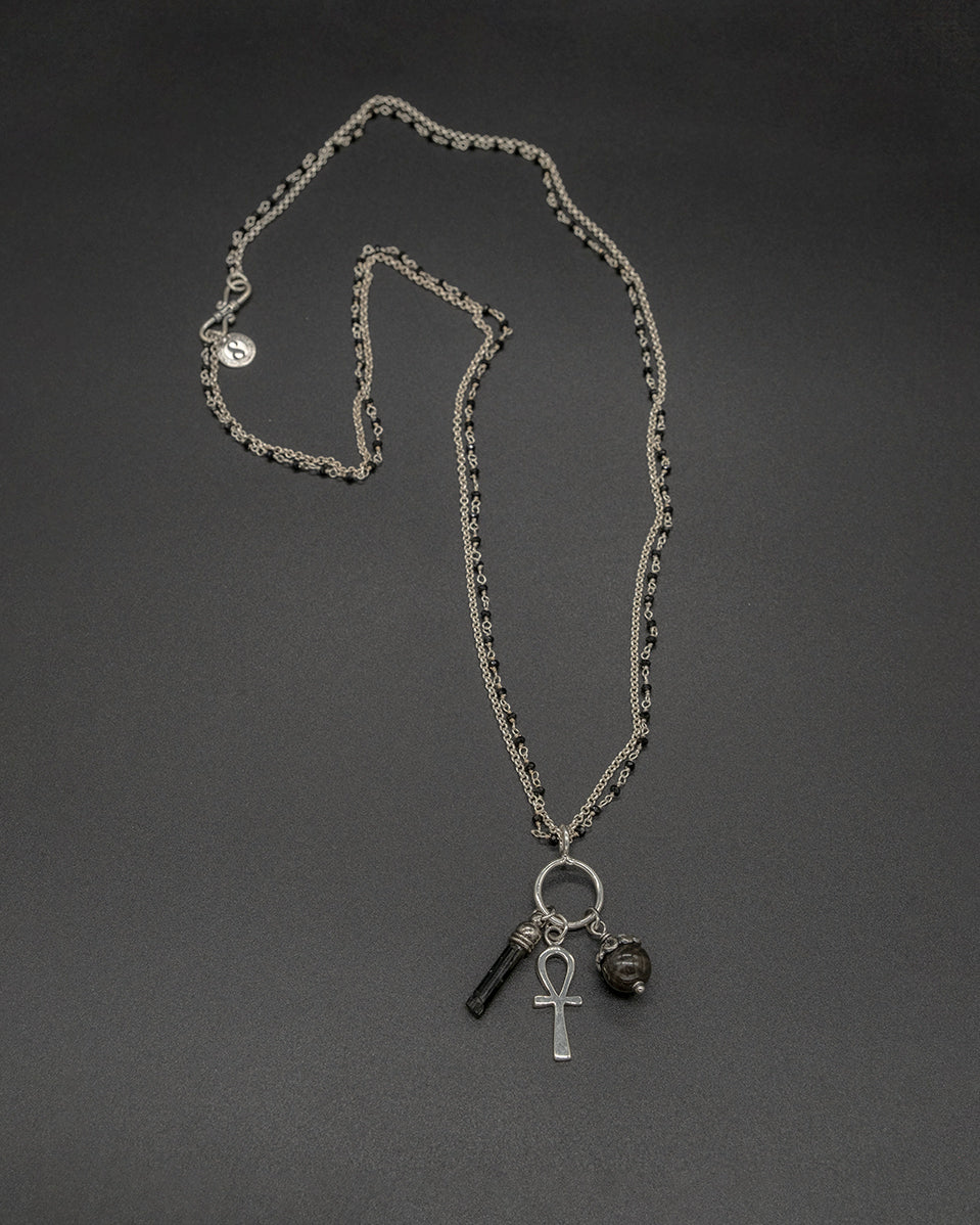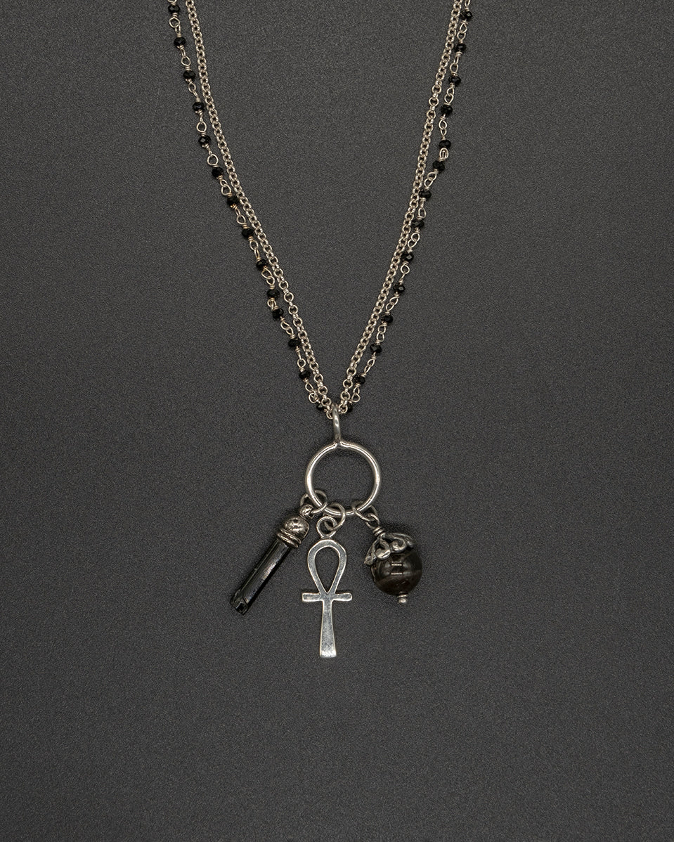 Channel the mystical allure of Egypt with our captivating multi-charm necklace. This piece combines the powerful symbols of Ankh with a striking black tourmaline point and dark labradorite orb. The onyx silver double chain complements the elegant design.