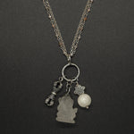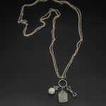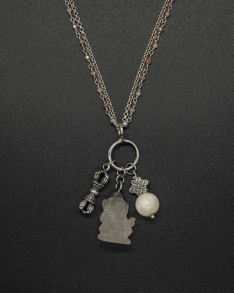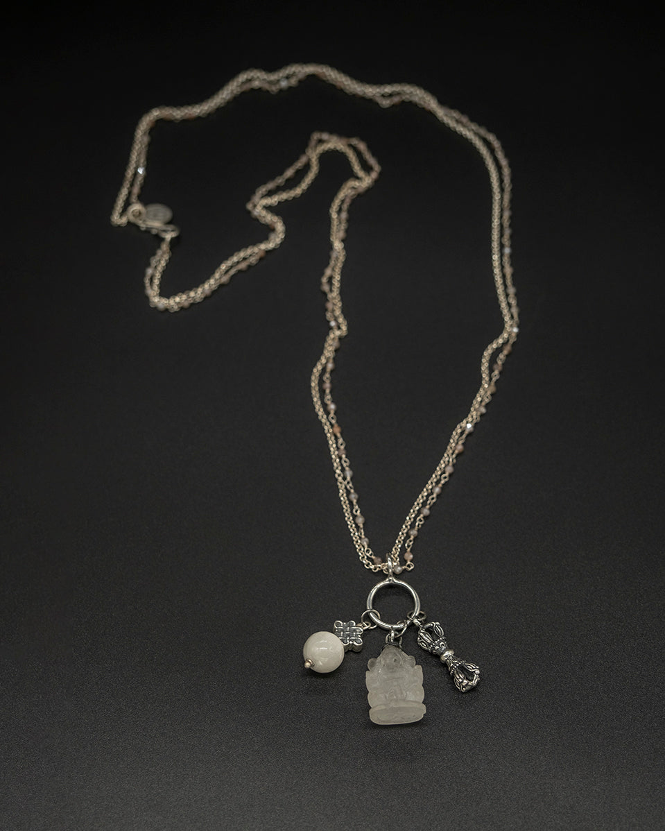 Crystal quartz Ganesha pendant paired with an endless-knot motif and selenite vajra accents, creating a protective and uplifting energy piece. Finished with a silver peach moonstone double chain for a soft, balanced glow. A meaningful talisman with elegant detail.