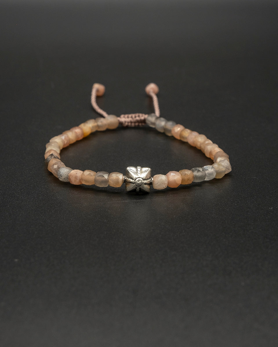A blend of luminous multi-moonstone beads paired with a silver box accent, creating a soft, iridescent piece with calm energy and elegant charm. Fully adjustable for a comfortable, everyday fit.