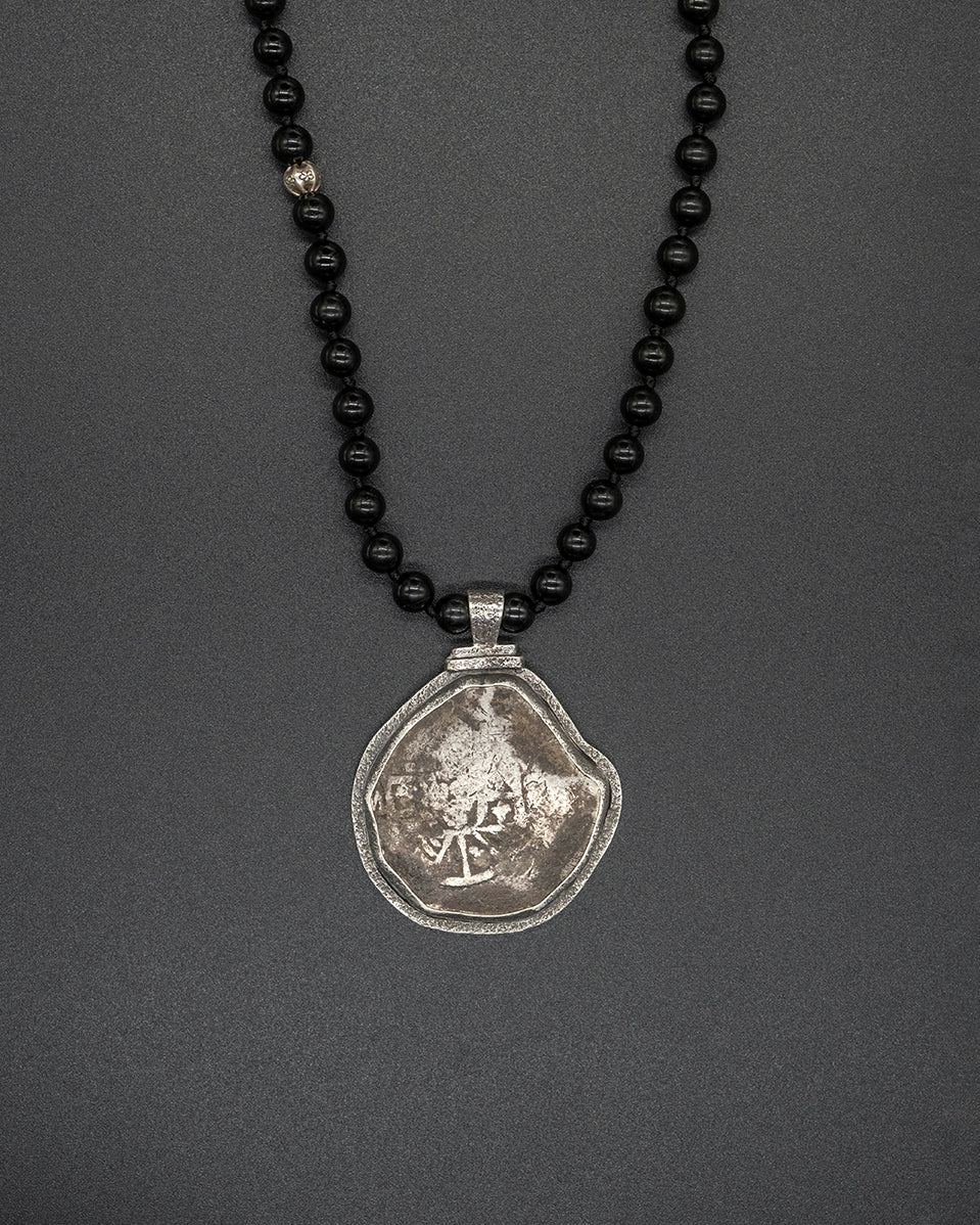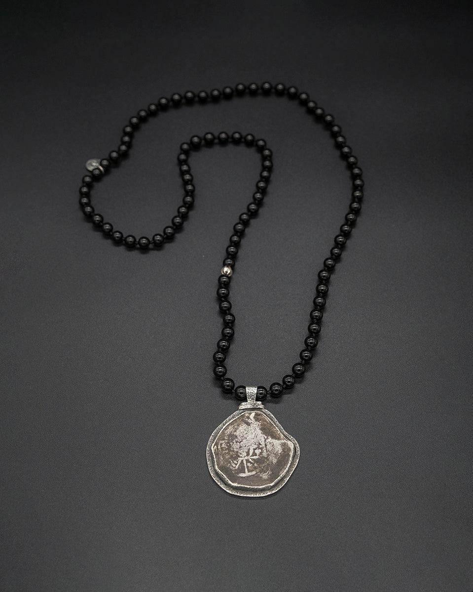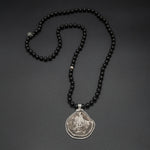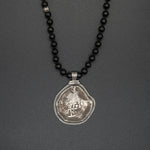 This unique piece features a vintage, unknown coin, enclosed within a hand-textured silver frame and suspended from a black tourmaline bead chain. Carry a mysterious piece of history with you.