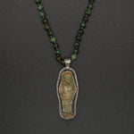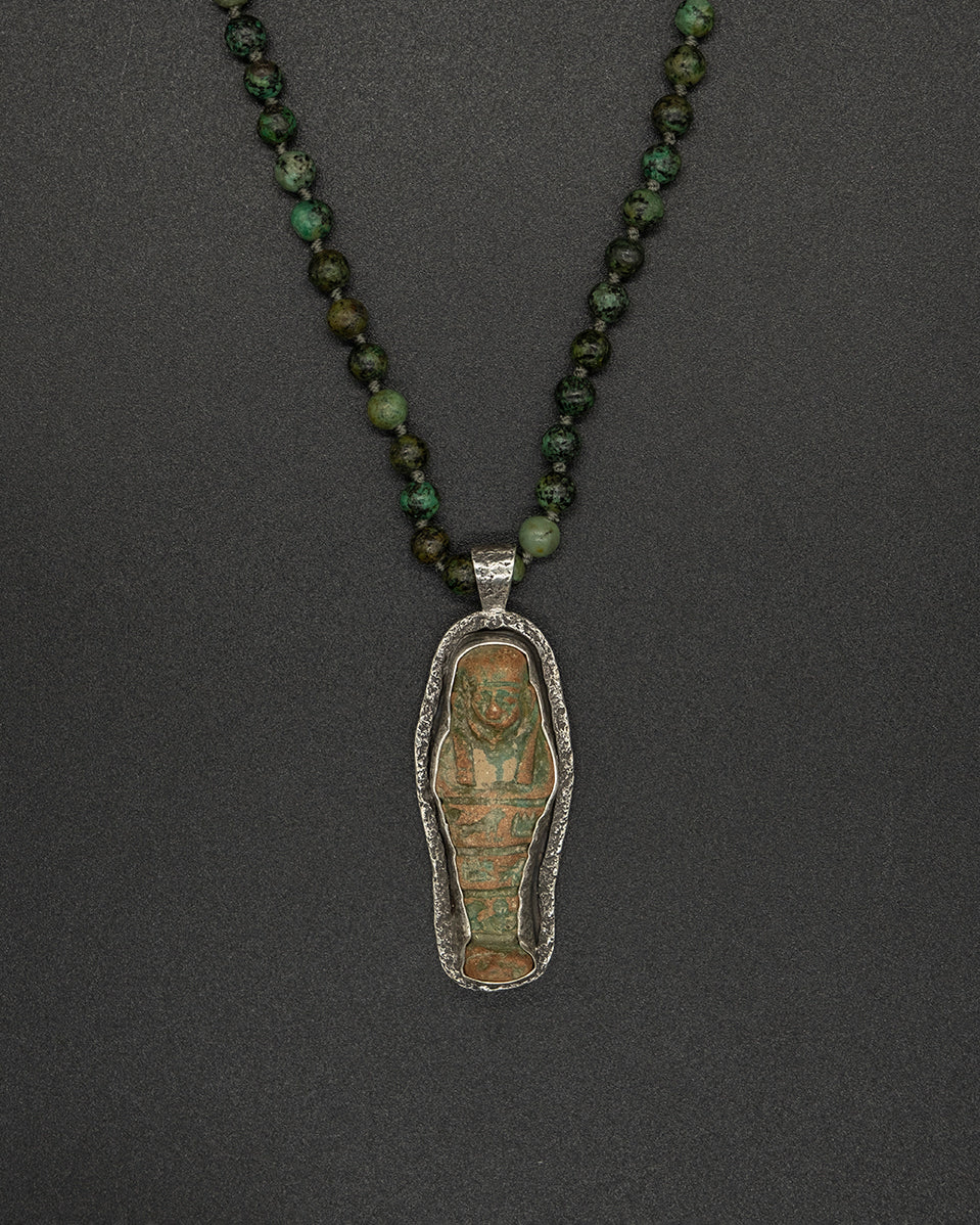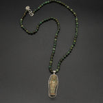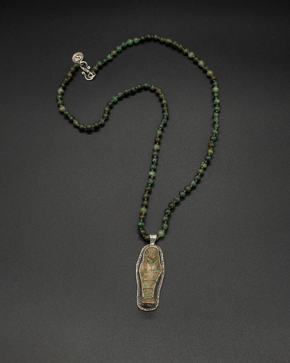 Hand-carved vintage clay Maahes pendant, paired with a hand-knotted African turquoise chain. A piece that embodies strength and calm awareness, carrying the grounding energy of the earth and the serene focus of the turquoise — a symbol of protection, healing, serenity, and spiritual connection.